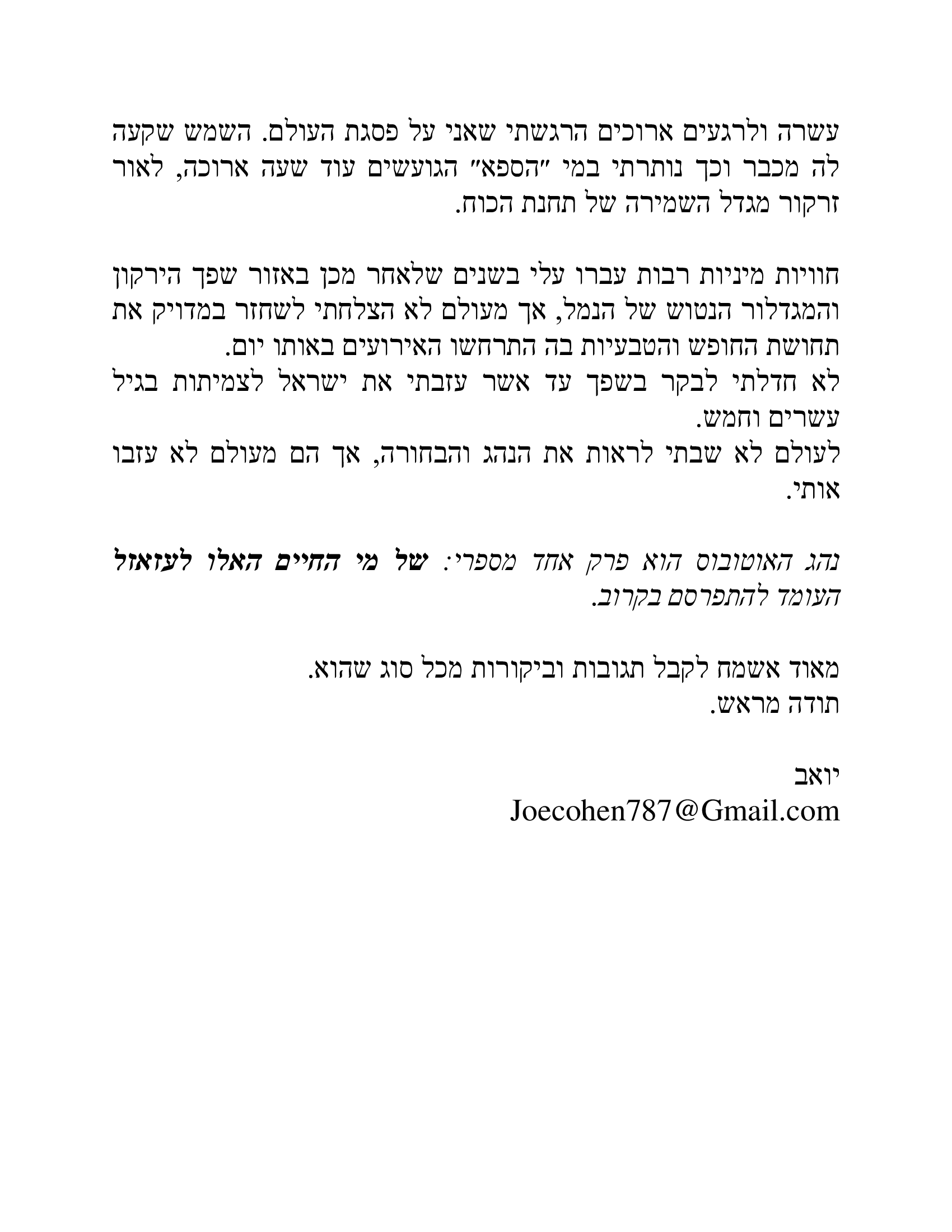 באפשרותך לכתוב כאן את תגובתך ליצירה שקראת. נא לשמור על שפה נאותה ומכובדת כדי שהנהלת האתר תאשר את פרסום תגובתך. כמו-כן ניתן לדרג את הנאתך מקריאת היצירה בין 1-5 כוכבים.