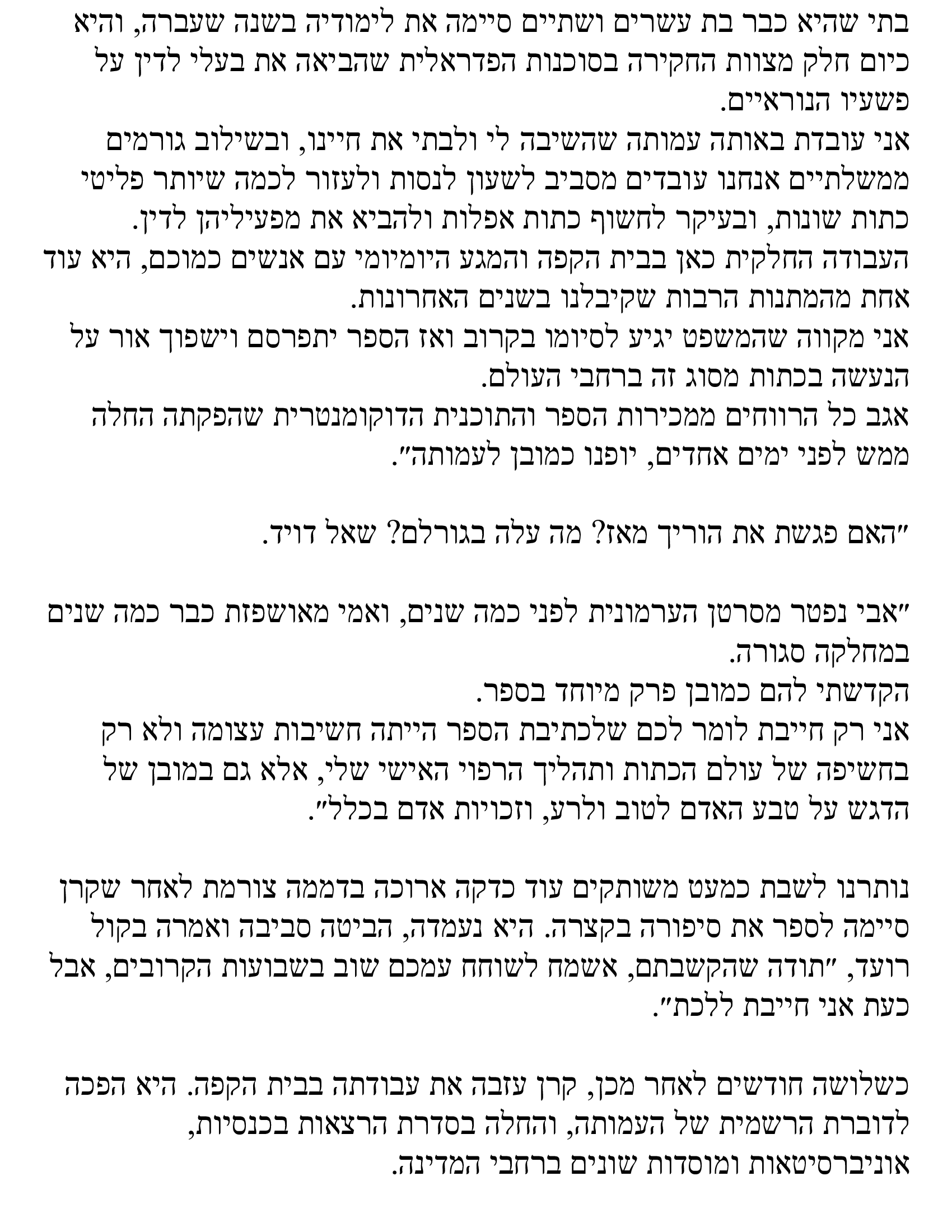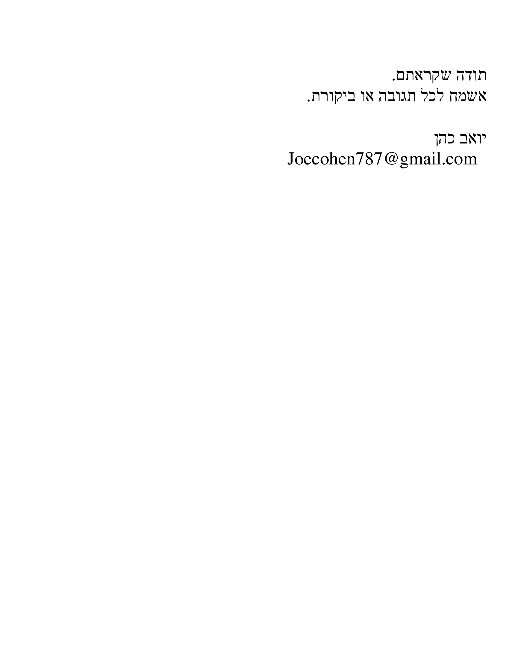 באפשרותך לכתוב כאן את תגובתך ליצירה שקראת. נא לשמור על שפה נאותה ומכובדת כדי שהנהלת האתר תאשר את פרסום תגובתך. כמו-כן ניתן לדרג את הנאתך מקריאת היצירה בין 1-5 כוכבים.