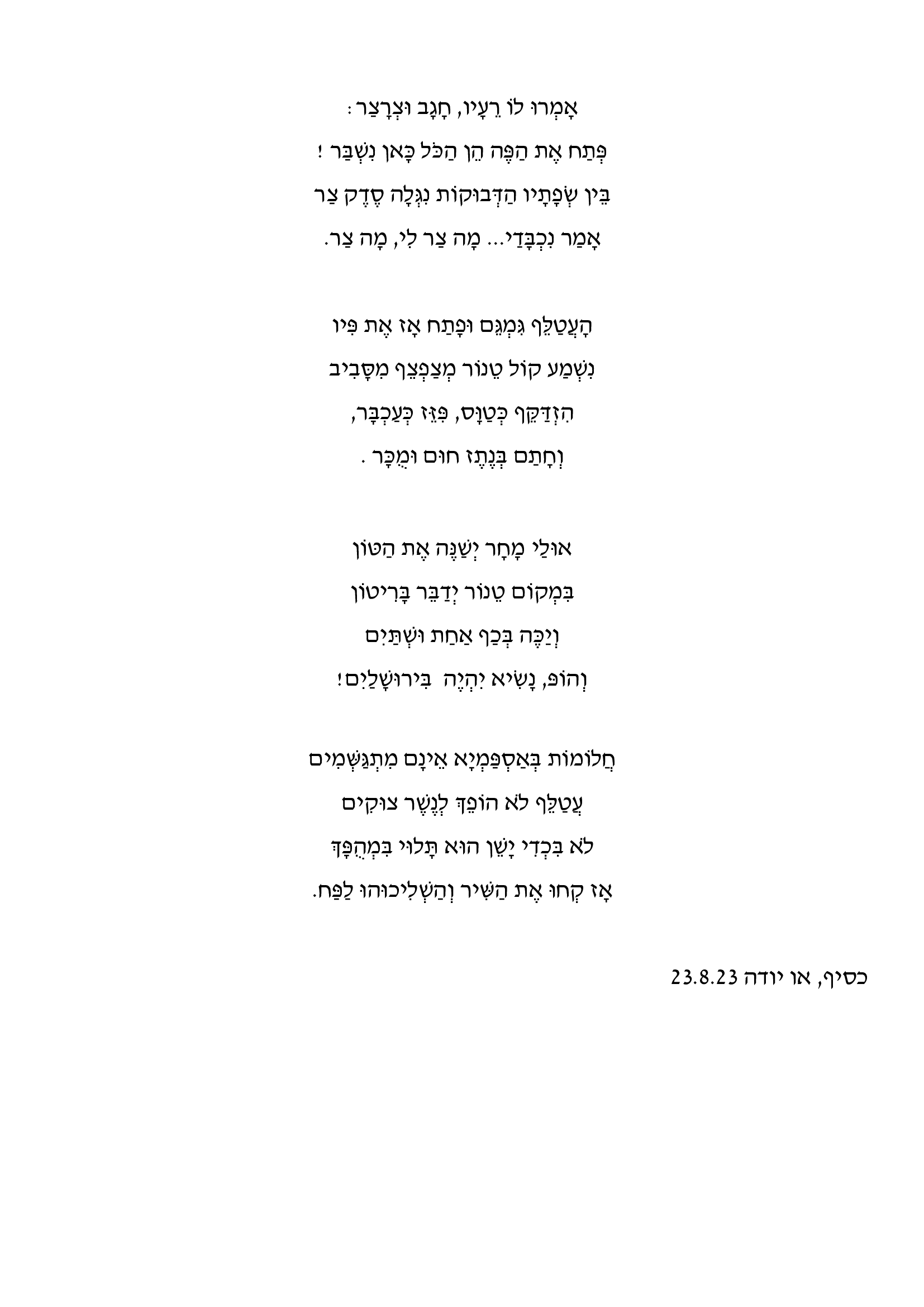 באפשרותך לכתוב כאן את תגובתך ליצירה שקראת. נא לשמור על שפה נאותה ומכובדת כדי שהנהלת האתר תאשר את פרסום תגובתך. כמו-כן ניתן לדרג את הנאתך מקריאת היצירה בין 1-5 כוכבים.