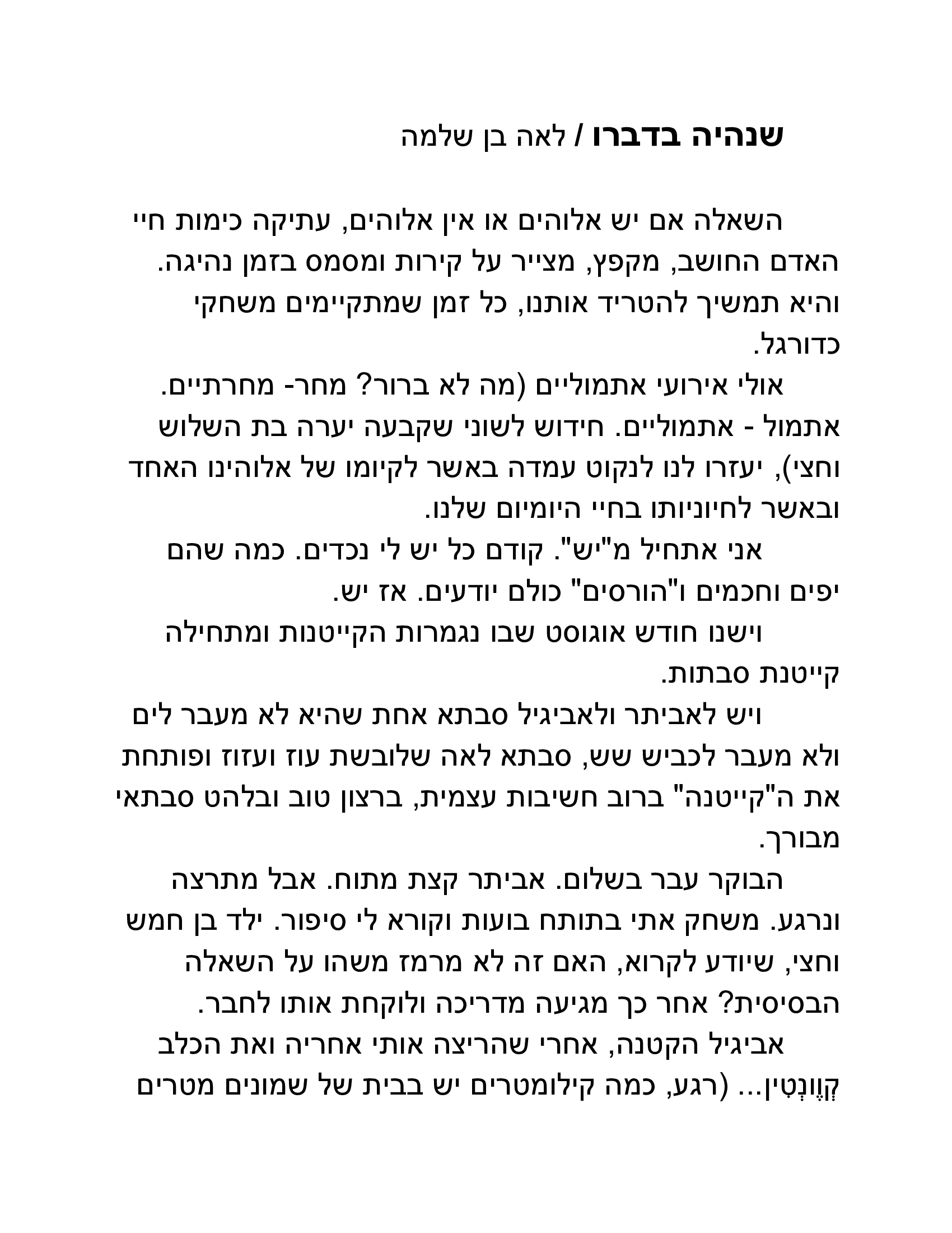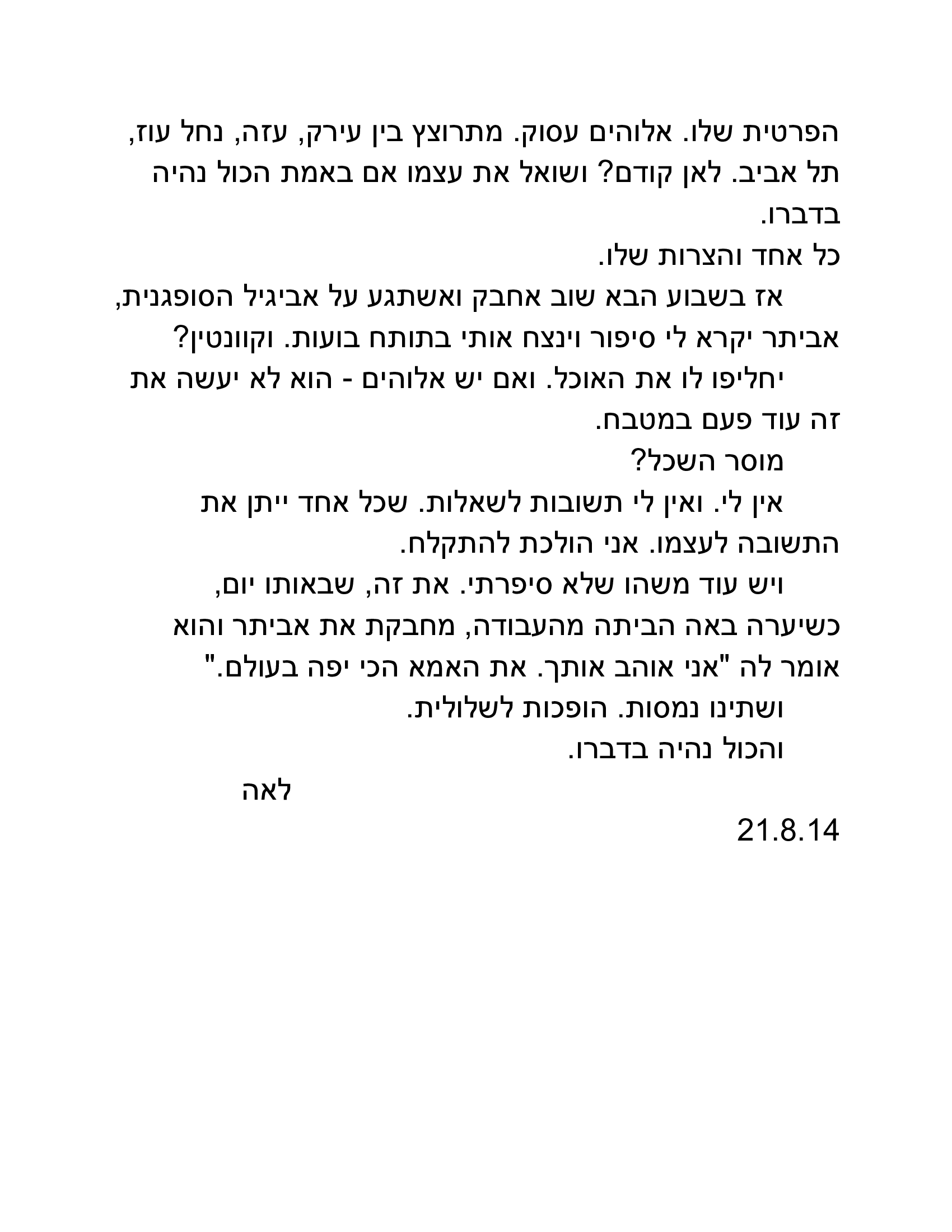 באפשרותך לכתוב כאן את תגובתך ליצירה שקראת. נא לשמור על שפה נאותה ומכובדת כדי שהנהלת האתר תאשר את פרסום תגובתך. כמו-כן ניתן לדרג את הנאתך מקריאת היצירה בין 1-5 כוכבים.