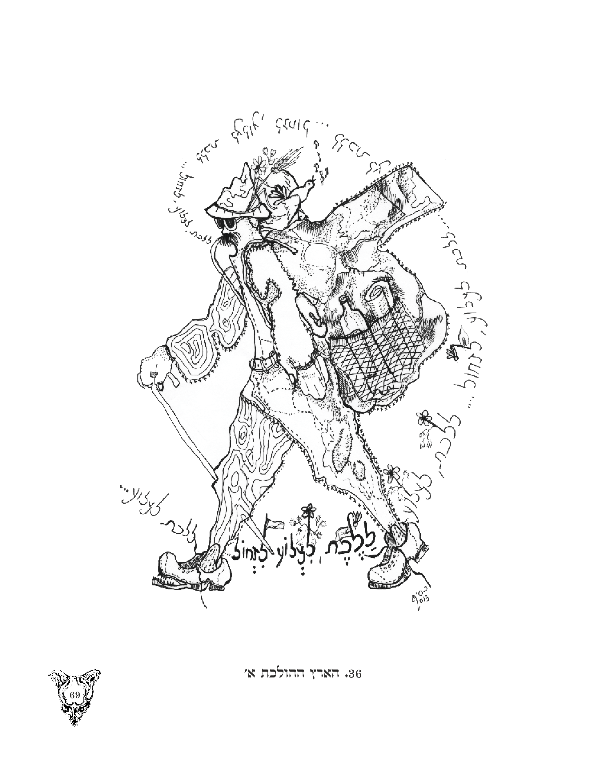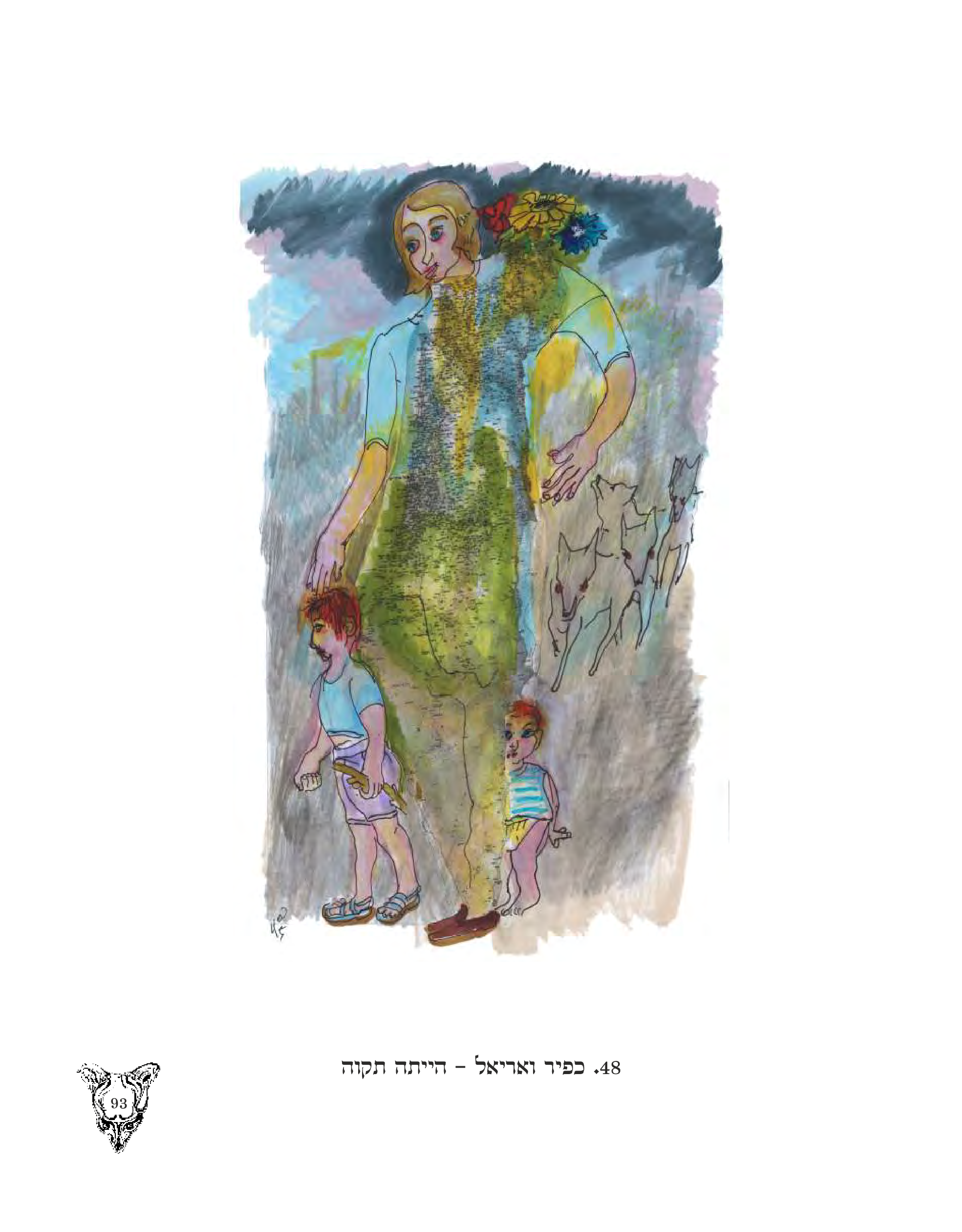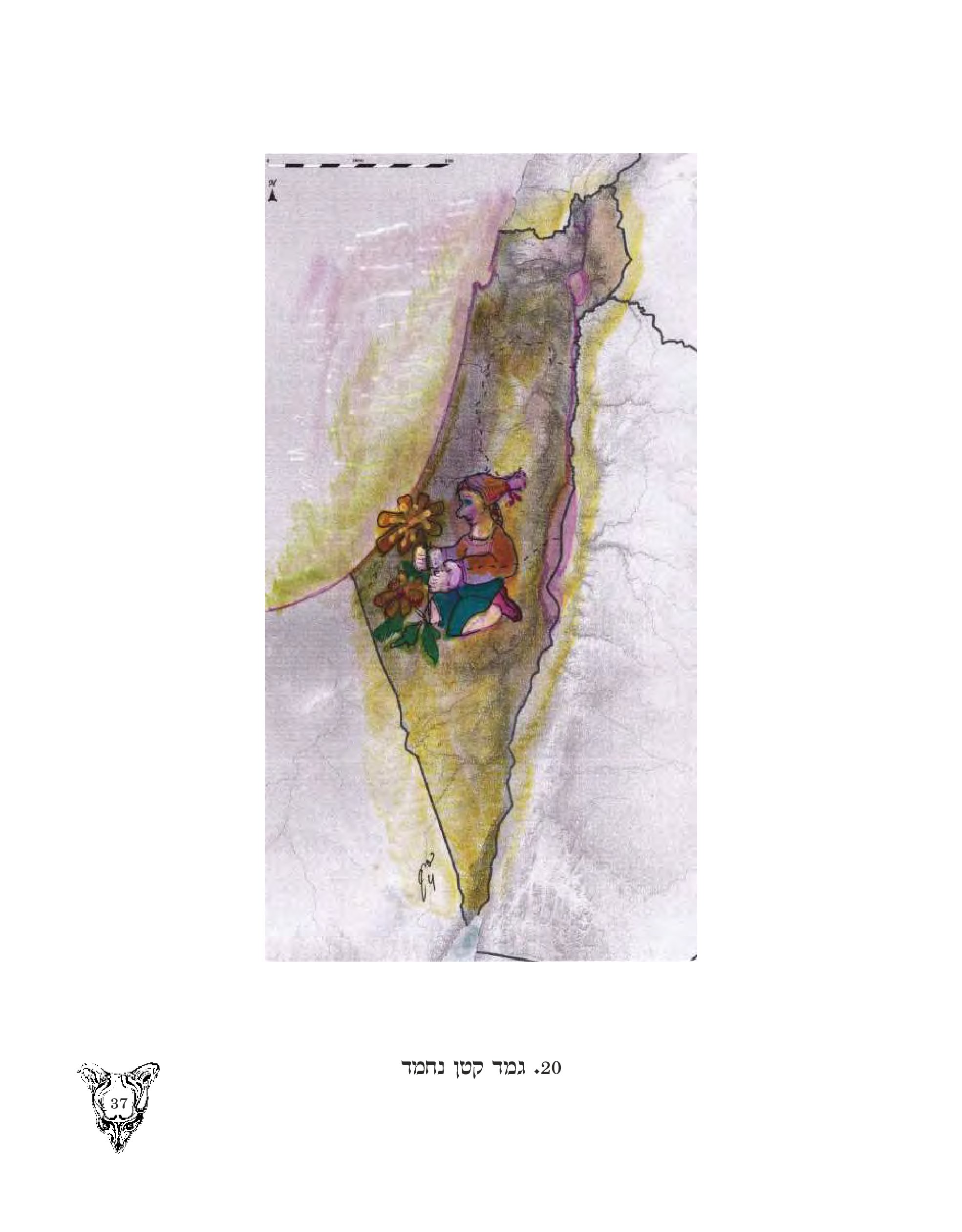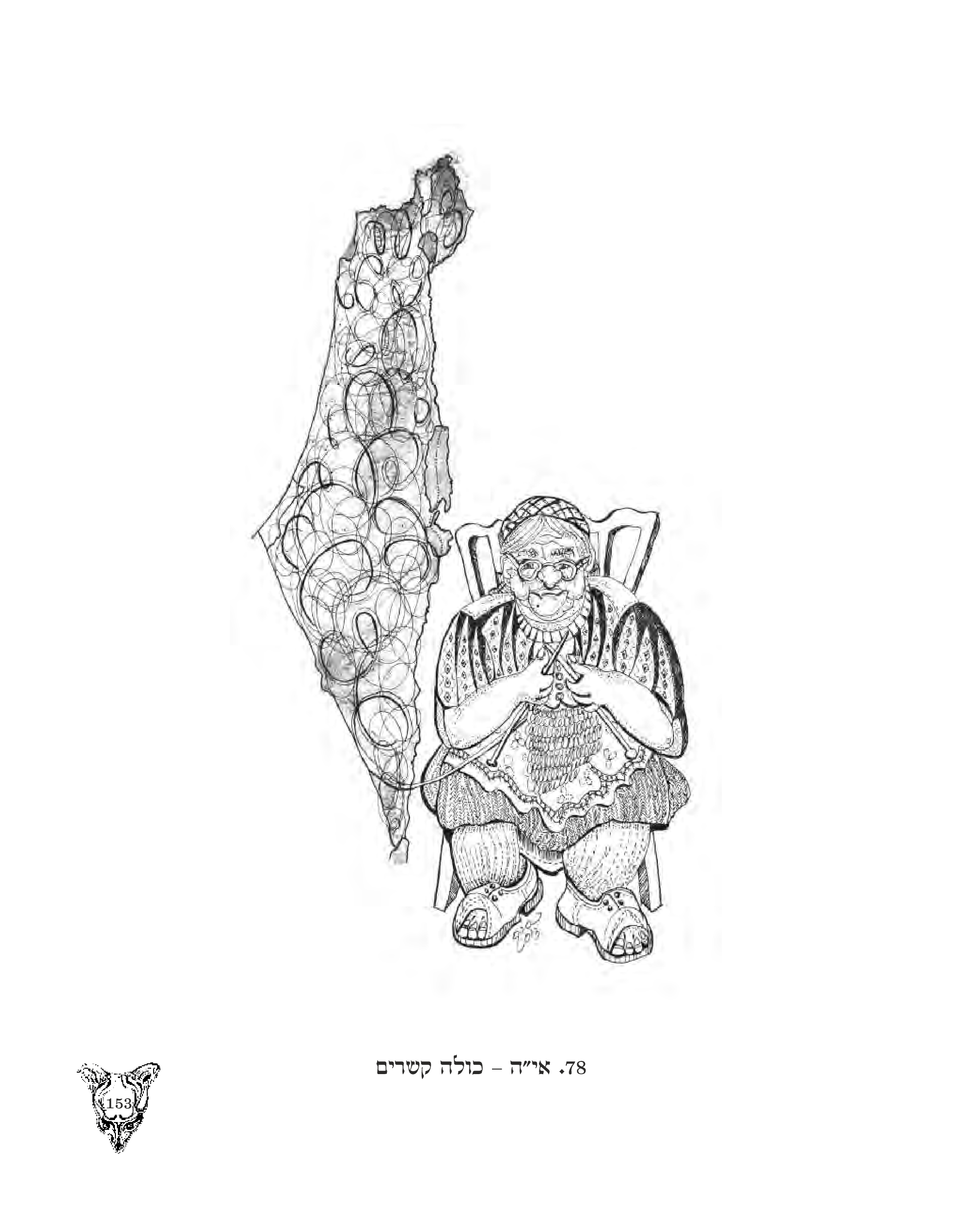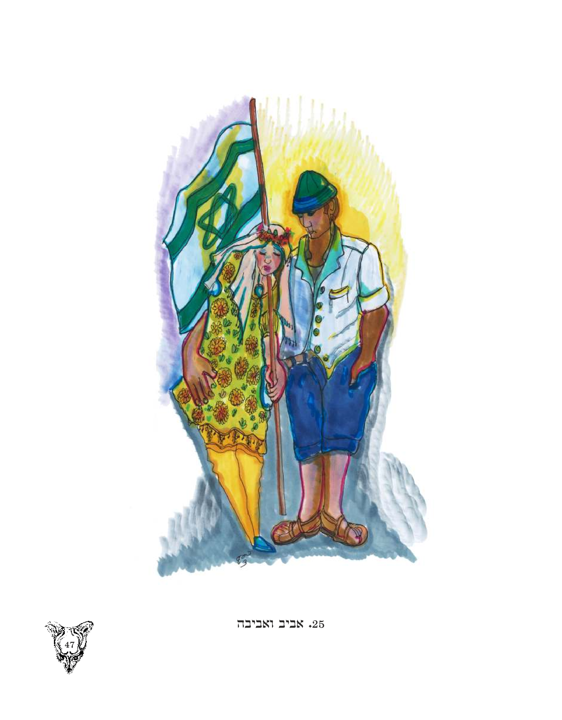 אחר כך המפגש עם ההקדמה המבהירה את הפרופורציות האחרות – ארץ ישראל שלך בגבולות 1967 מציגה מציאות רבודה של הומור וכאב, שעשוע ורצינות, התחכמות ומסר ישיר. ואז פגשתי בשמות ההורים, וחייכתי למראה שמות האבות שלכם – ייתכן ששניהם הגיעו מאותה התפוצה, אך בעוד שמו של האחד נותר נטוע שם – בעבוס, האחר עם שם מפתיע אפילו למי שהעתיק שורשיו לארץ חדשה – אושר. ואז פגשתי את דמויות הוריך – אם גדולה שעיניה מכוסות, כף ידה גדולה, יד ענקים (שמה לאל?) ואב זעיר טומן ידיו בכיסים ומבטו מוסט (לאן?). ציור שעשה עליי רושם מיוחד הו