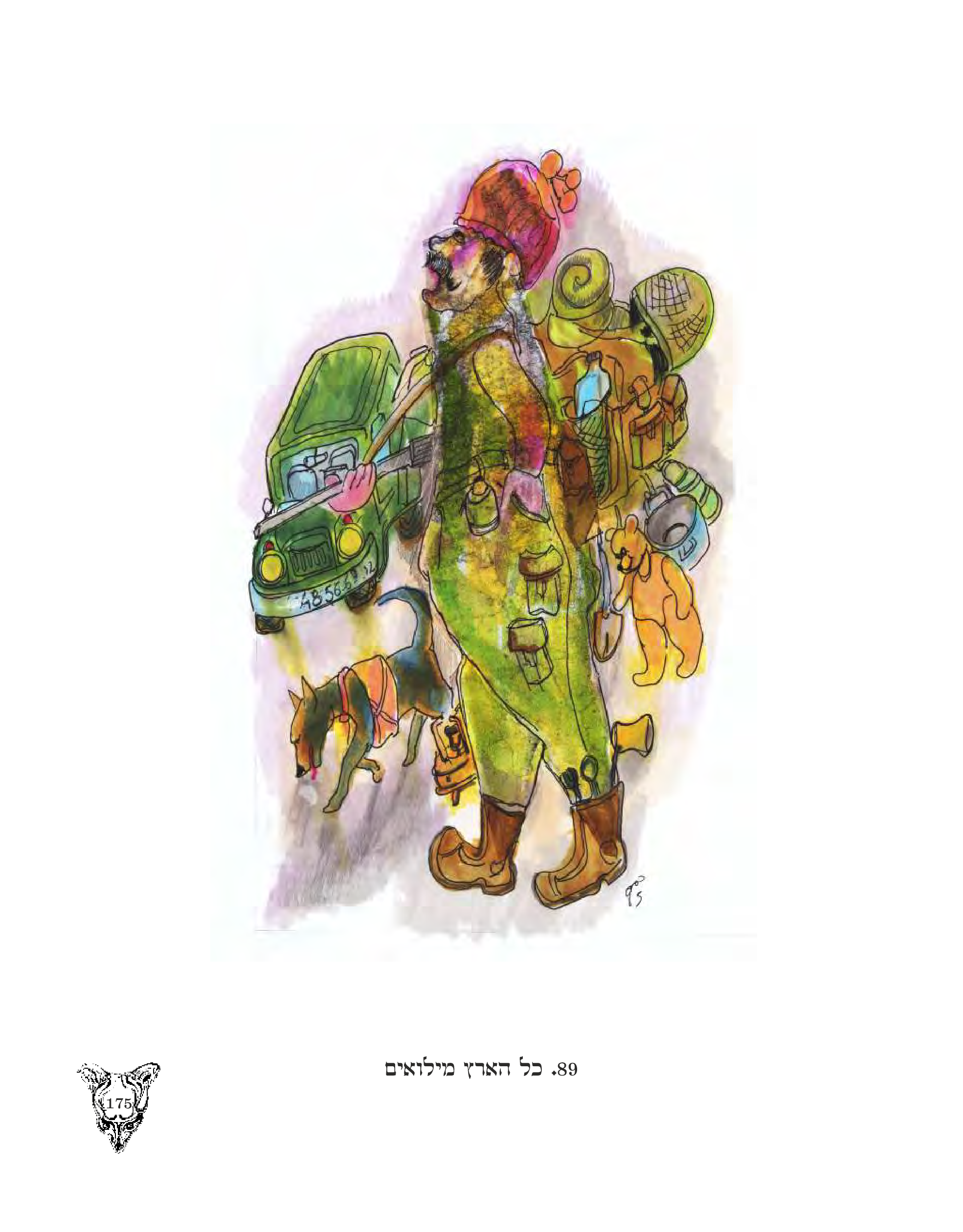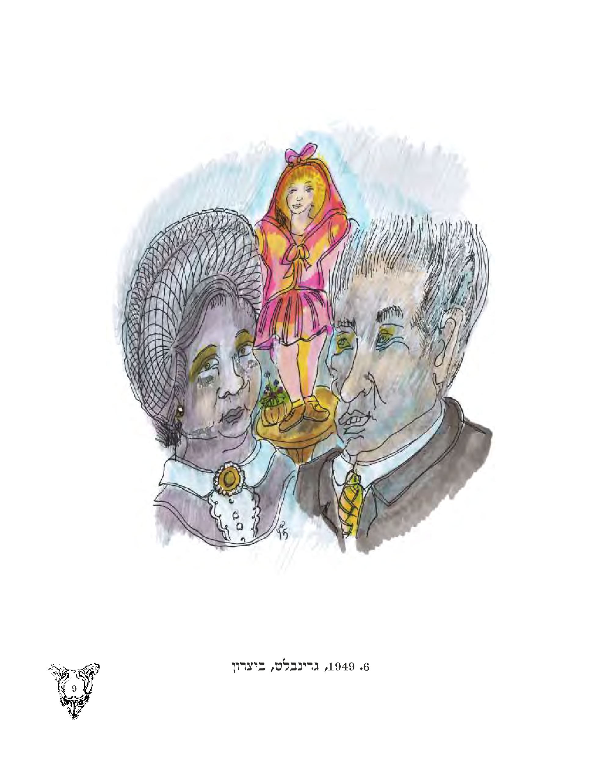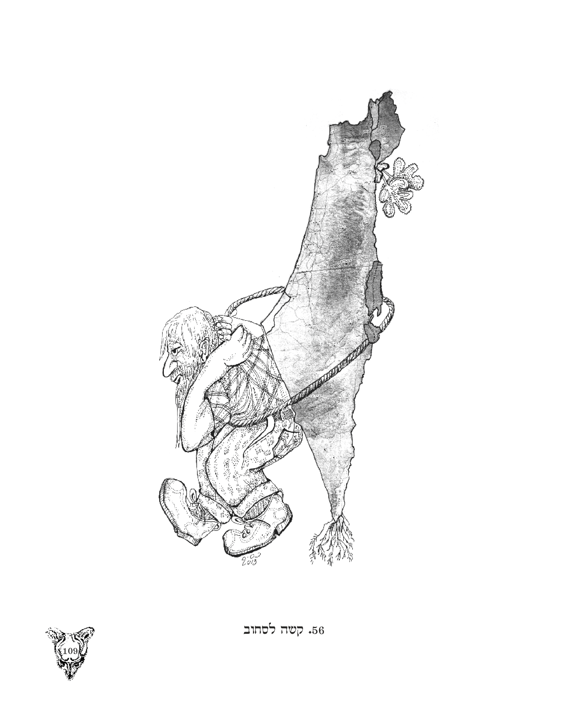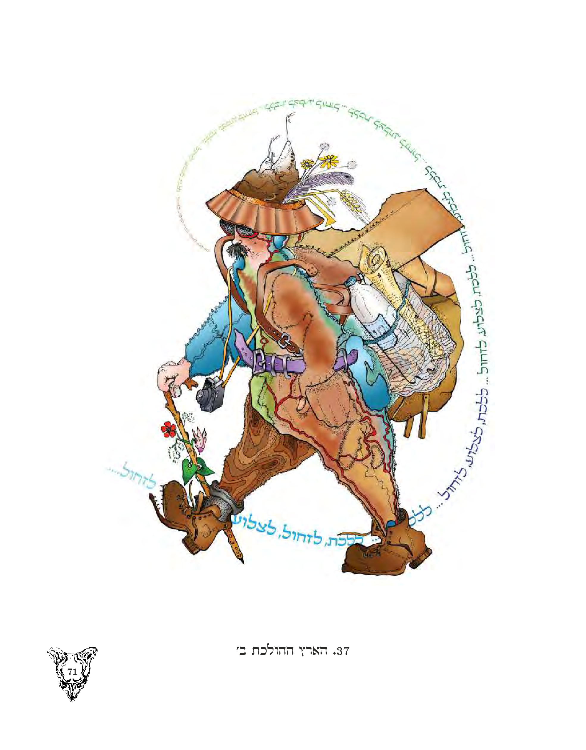אחר כך המפגש עם ההקדמה המבהירה את הפרופורציות האחרות – ארץ ישראל שלך בגבולות 1967 מציגה מציאות רבודה של הומור וכאב, שעשוע ורצינות, התחכמות ומסר ישיר. ואז פגשתי בשמות ההורים, וחייכתי למראה שמות האבות שלכם – ייתכן ששניהם הגיעו מאותה התפוצה, אך בעוד שמו של האחד נותר נטוע שם – בעבוס, האחר עם שם מפתיע אפילו למי שהעתיק שורשיו לארץ חדשה – אושר. ואז פגשתי את דמויות הוריך – אם גדולה שעיניה מכוסות, כף ידה גדולה, יד ענקים (שמה לאל?) ואב זעיר טומן ידיו בכיסים ומבטו מוסט (לאן?). ציור שעשה עליי רושם מיוחד הו
