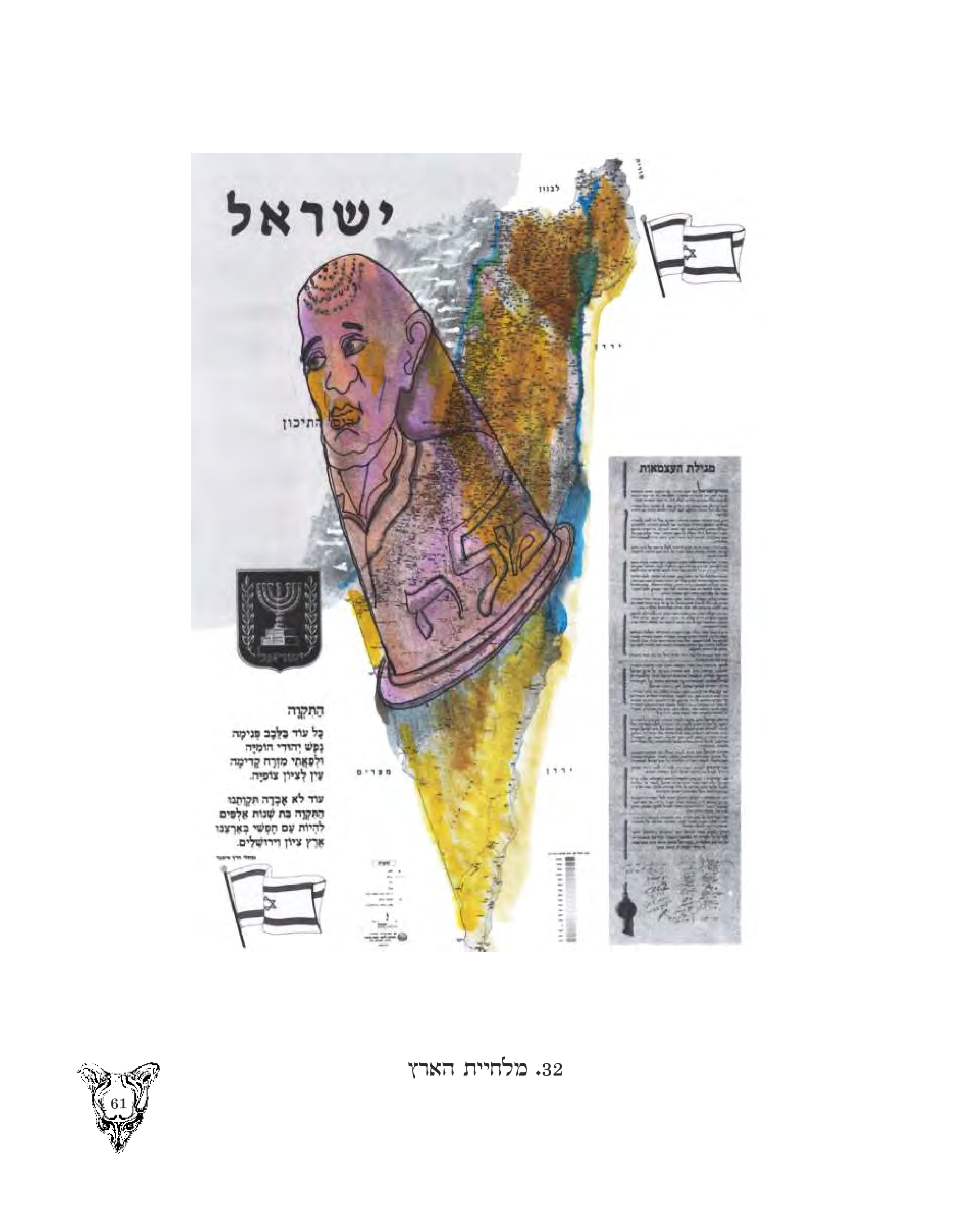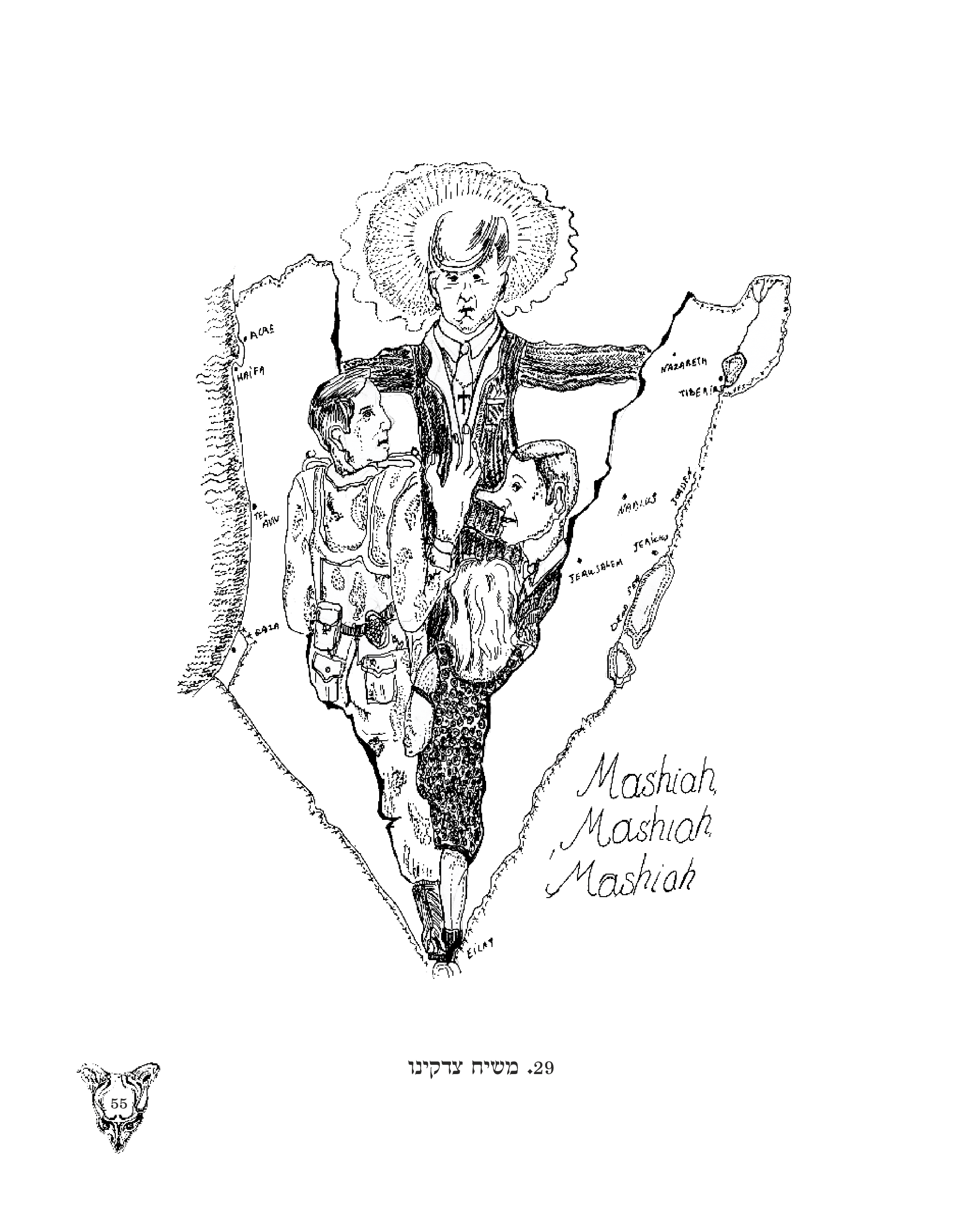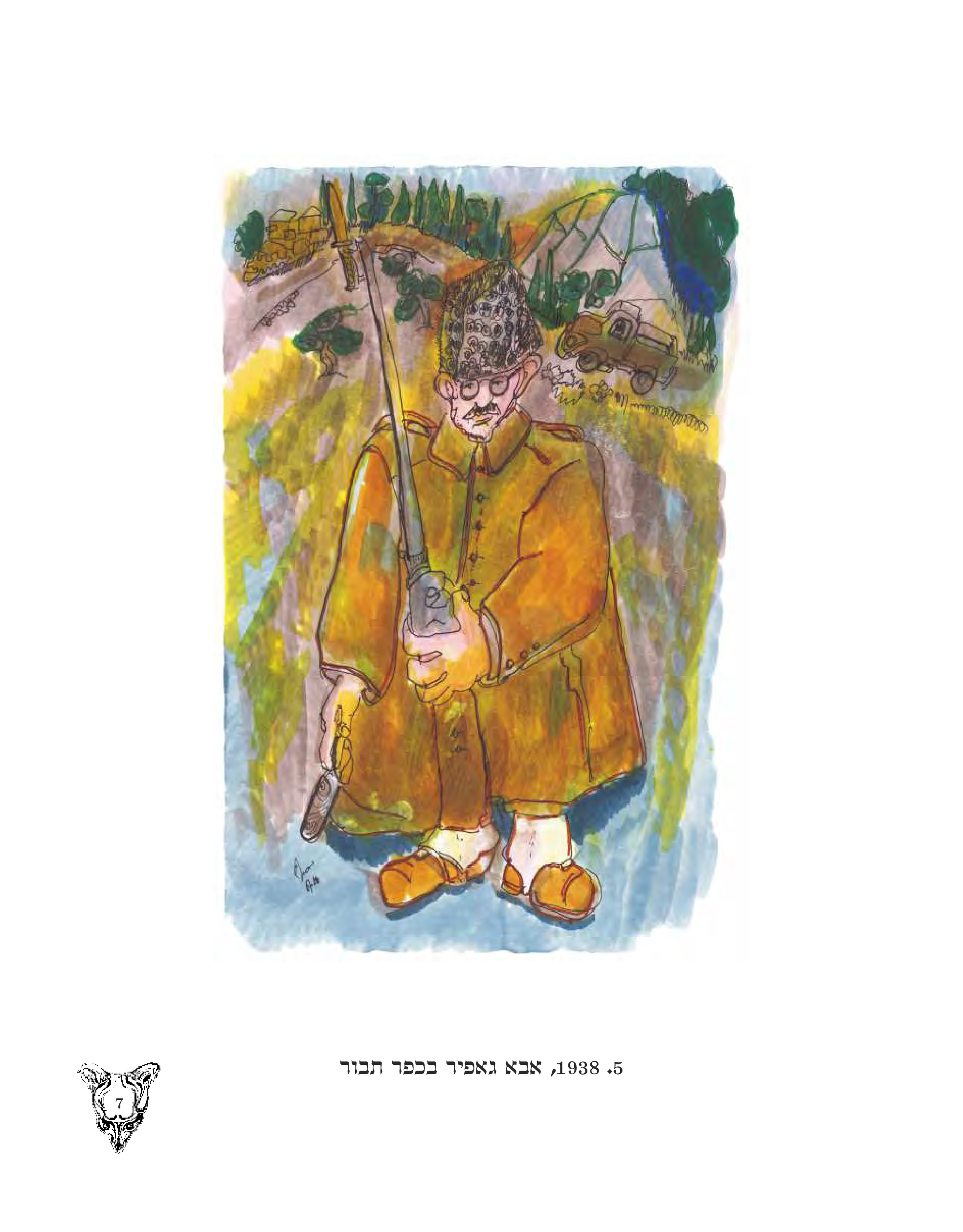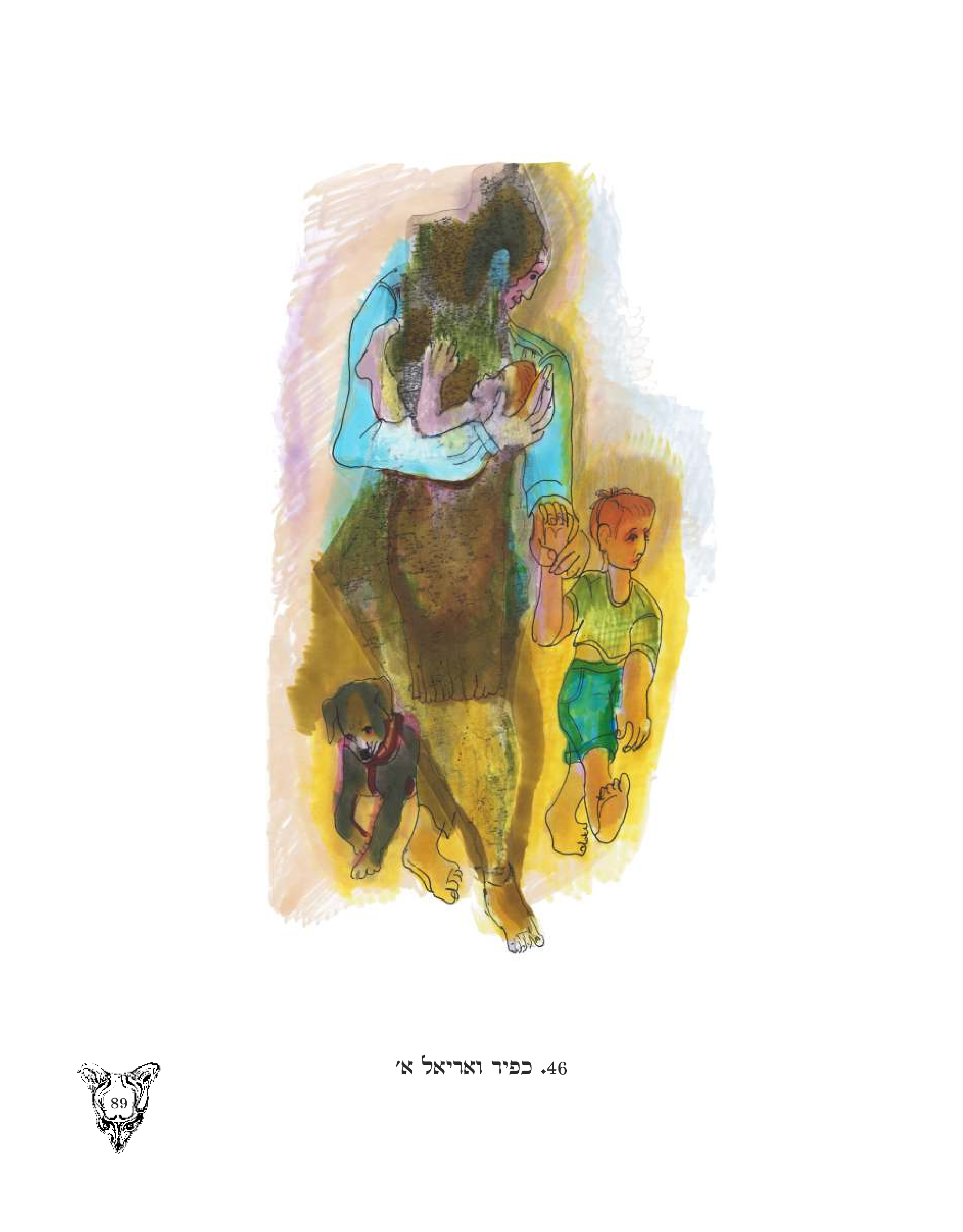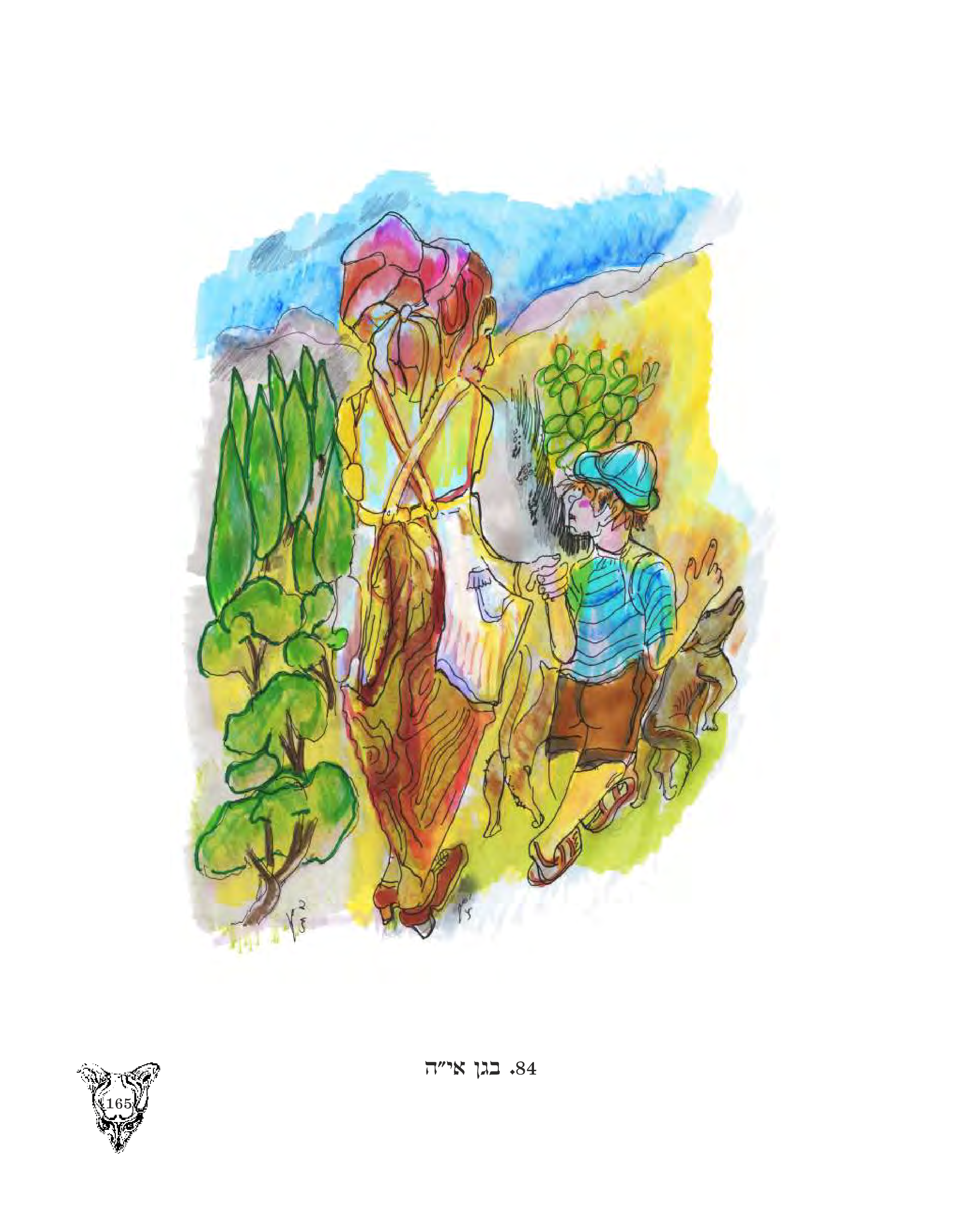 אחר כך המפגש עם ההקדמה המבהירה את הפרופורציות האחרות – ארץ ישראל שלך בגבולות 1967 מציגה מציאות רבודה של הומור וכאב, שעשוע ורצינות, התחכמות ומסר ישיר. ואז פגשתי בשמות ההורים, וחייכתי למראה שמות האבות שלכם – ייתכן ששניהם הגיעו מאותה התפוצה, אך בעוד שמו של האחד נותר נטוע שם – בעבוס, האחר עם שם מפתיע אפילו למי שהעתיק שורשיו לארץ חדשה – אושר. ואז פגשתי את דמויות הוריך – אם גדולה שעיניה מכוסות, כף ידה גדולה, יד ענקים (שמה לאל?) ואב זעיר טומן ידיו בכיסים ומבטו מוסט (לאן?). ציור שעשה עליי רושם מיוחד הו