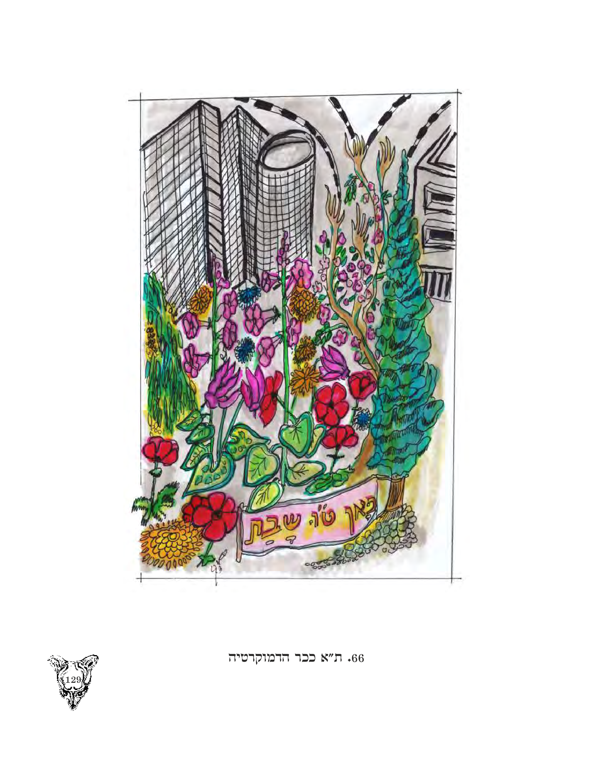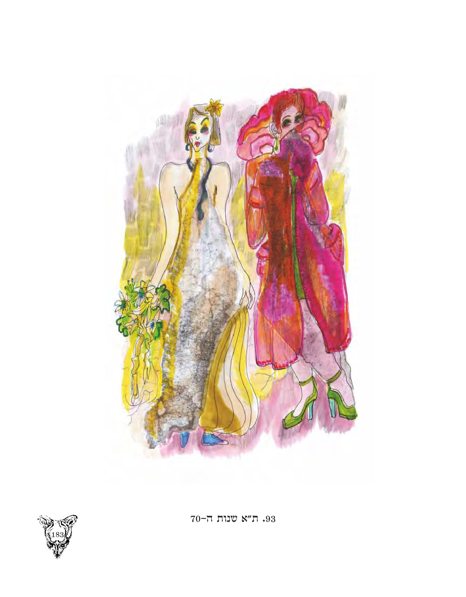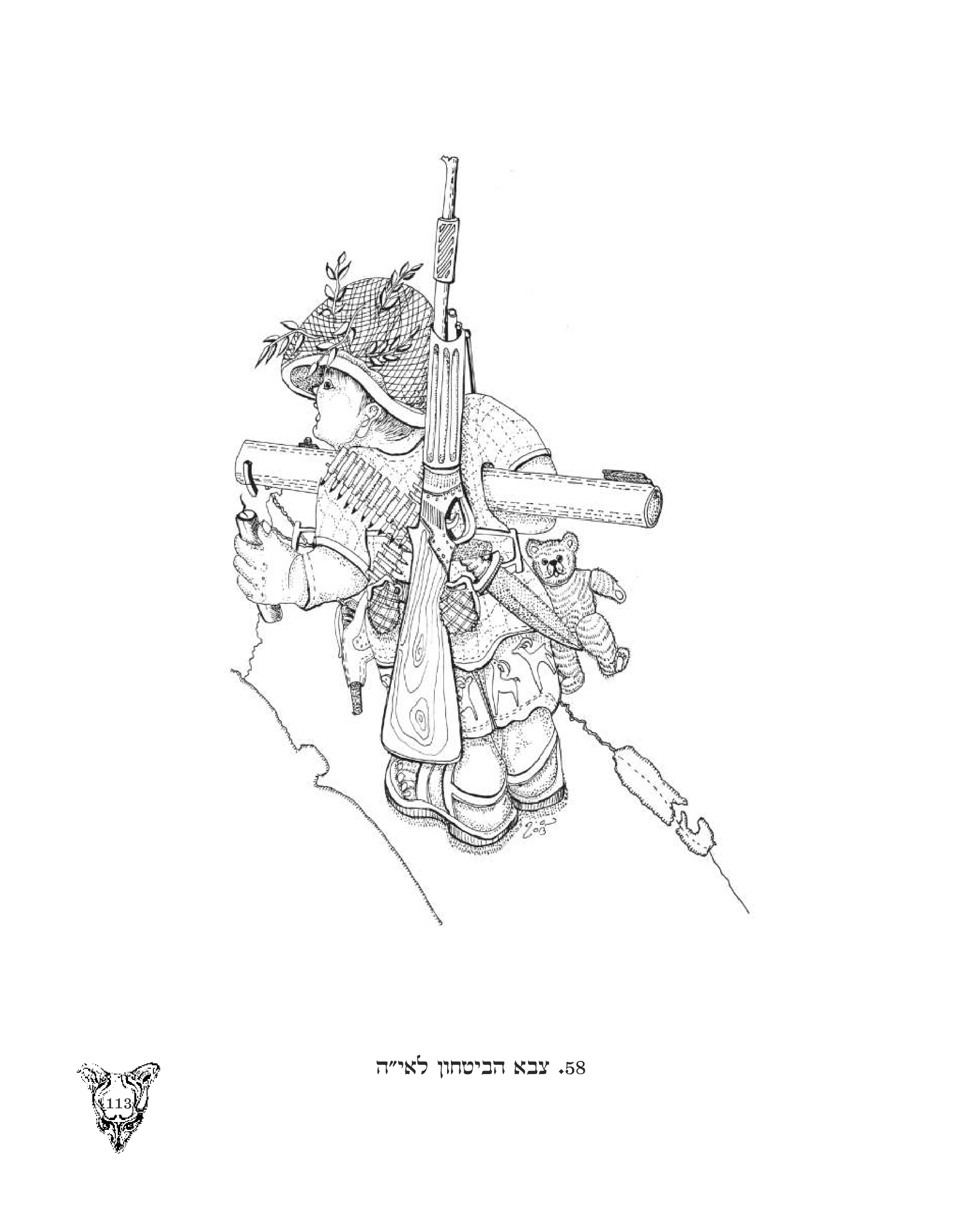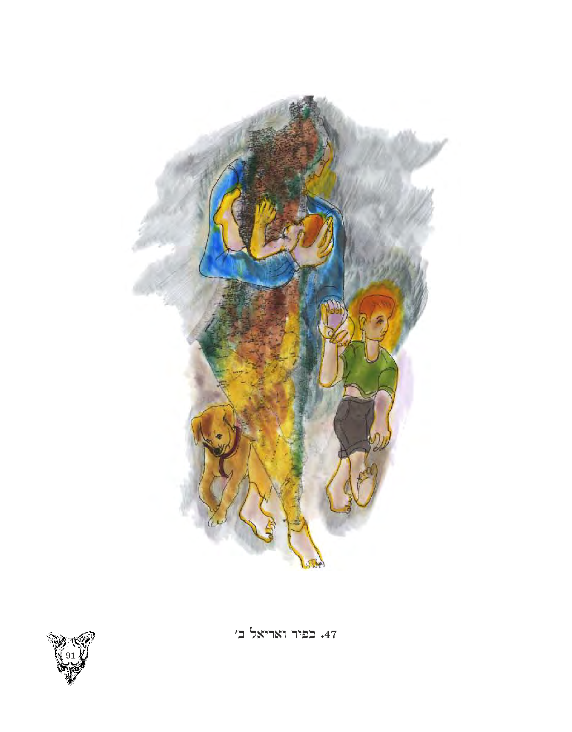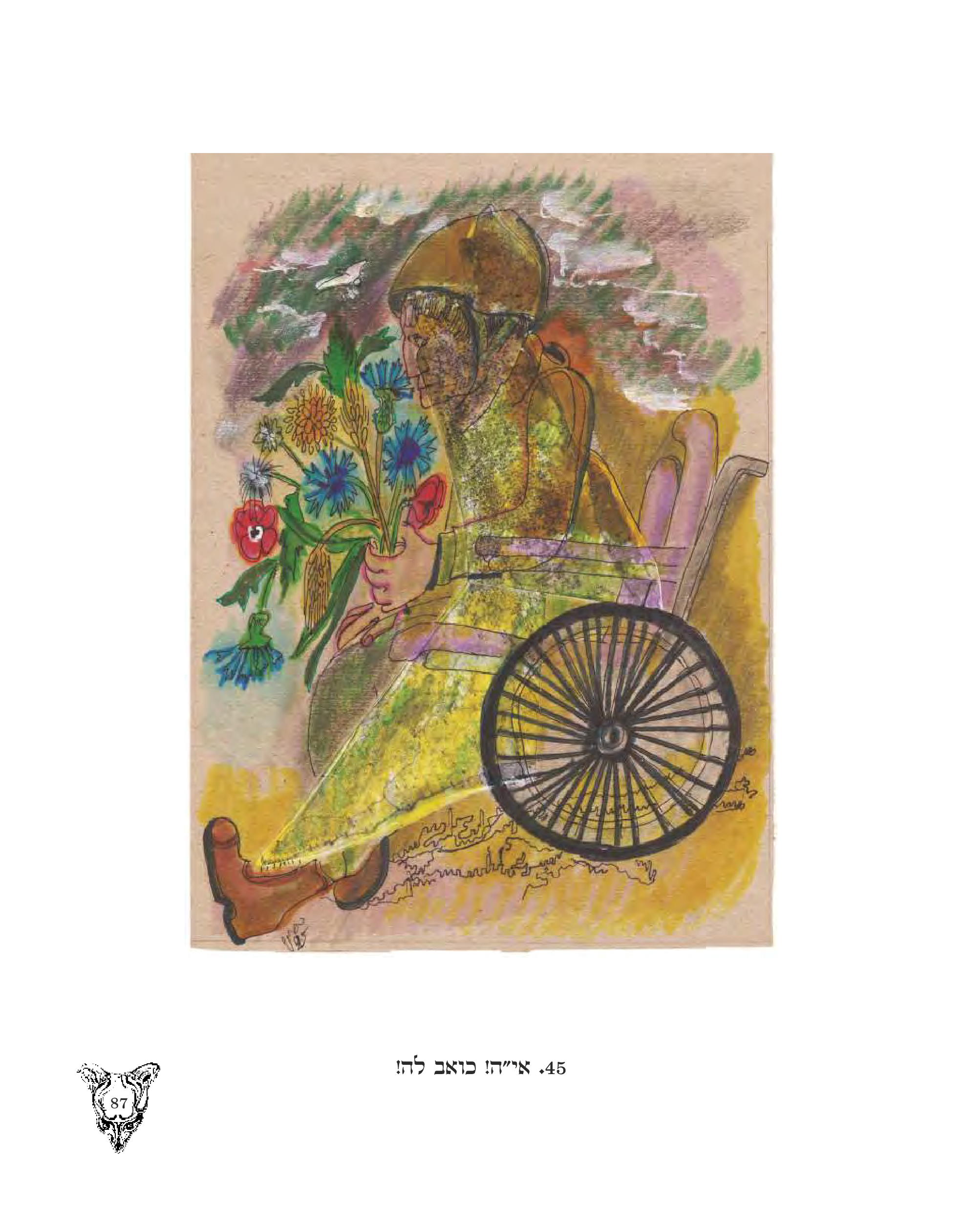 אחר כך המפגש עם ההקדמה המבהירה את הפרופורציות האחרות – ארץ ישראל שלך בגבולות 1967 מציגה מציאות רבודה של הומור וכאב, שעשוע ורצינות, התחכמות ומסר ישיר. ואז פגשתי בשמות ההורים, וחייכתי למראה שמות האבות שלכם – ייתכן ששניהם הגיעו מאותה התפוצה, אך בעוד שמו של האחד נותר נטוע שם – בעבוס, האחר עם שם מפתיע אפילו למי שהעתיק שורשיו לארץ חדשה – אושר. ואז פגשתי את דמויות הוריך – אם גדולה שעיניה מכוסות, כף ידה גדולה, יד ענקים (שמה לאל?) ואב זעיר טומן ידיו בכיסים ומבטו מוסט (לאן?). ציור שעשה עליי רושם מיוחד הו