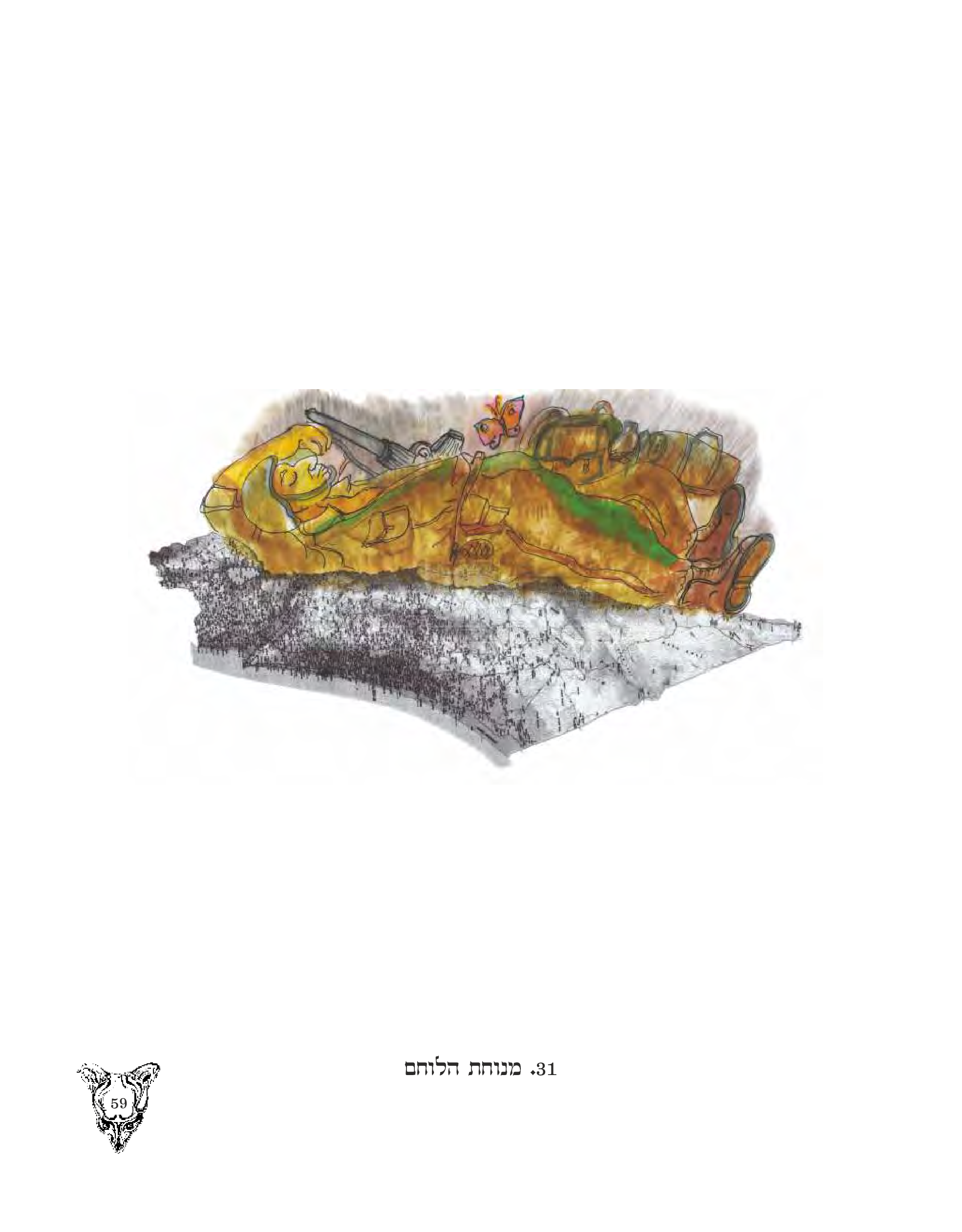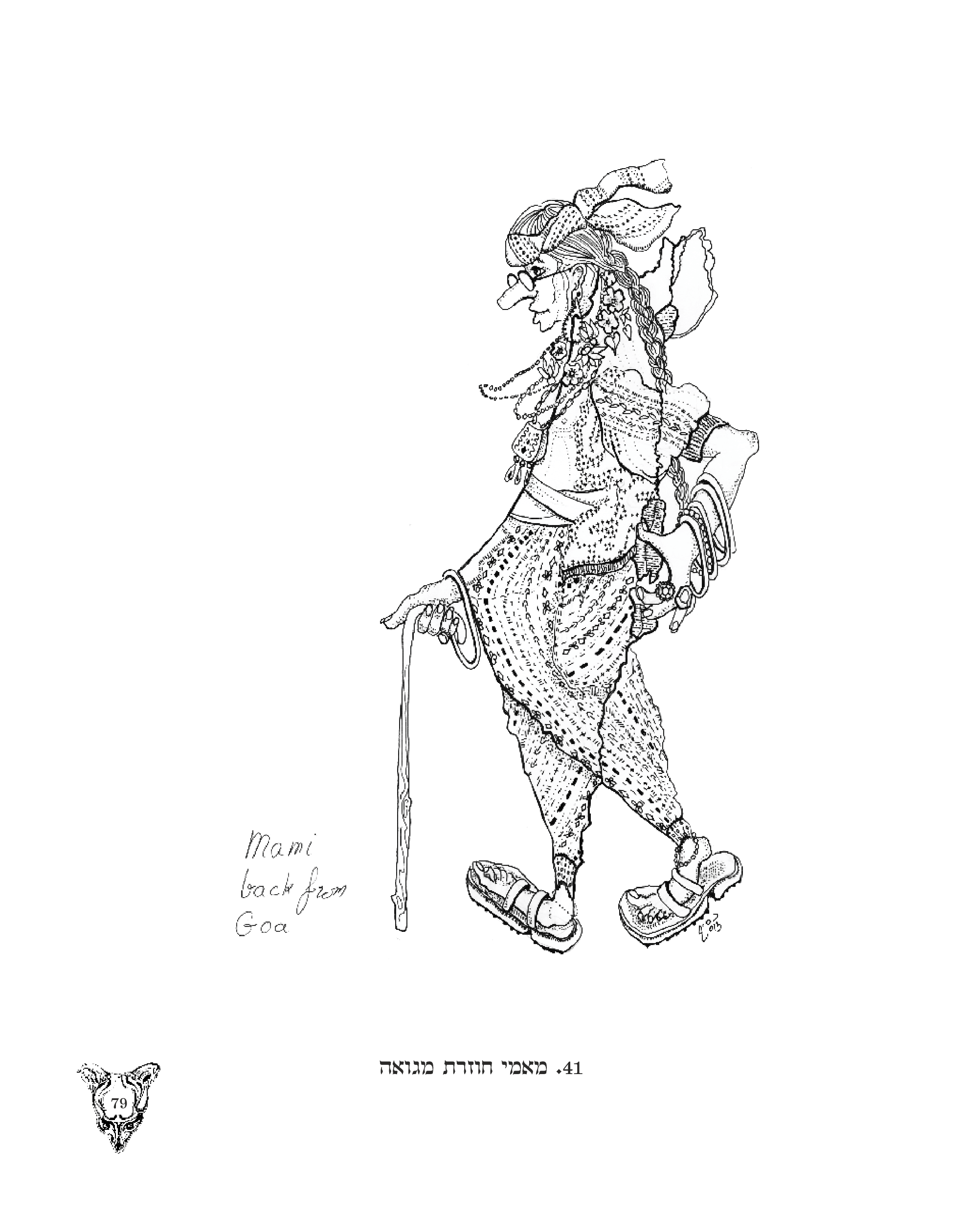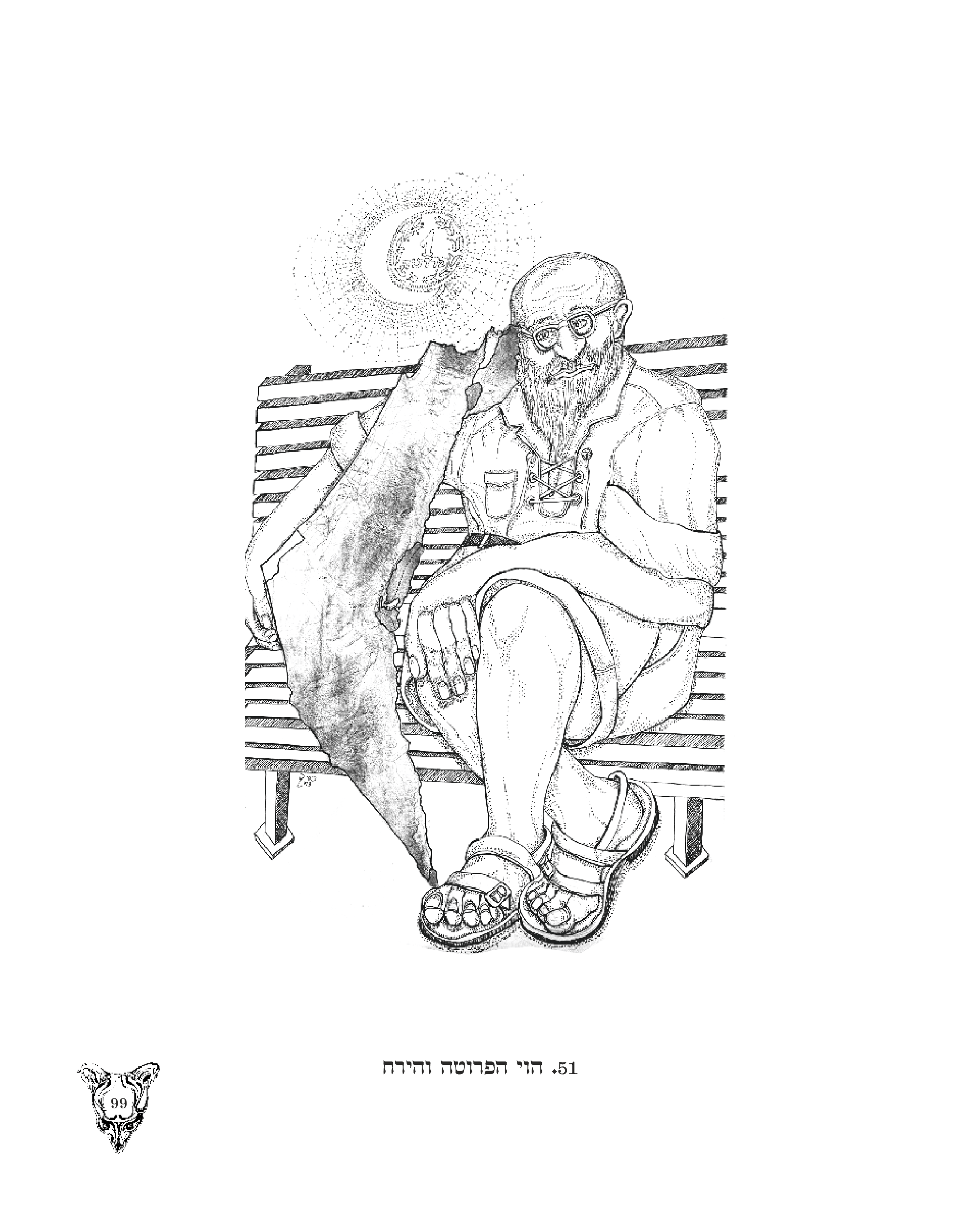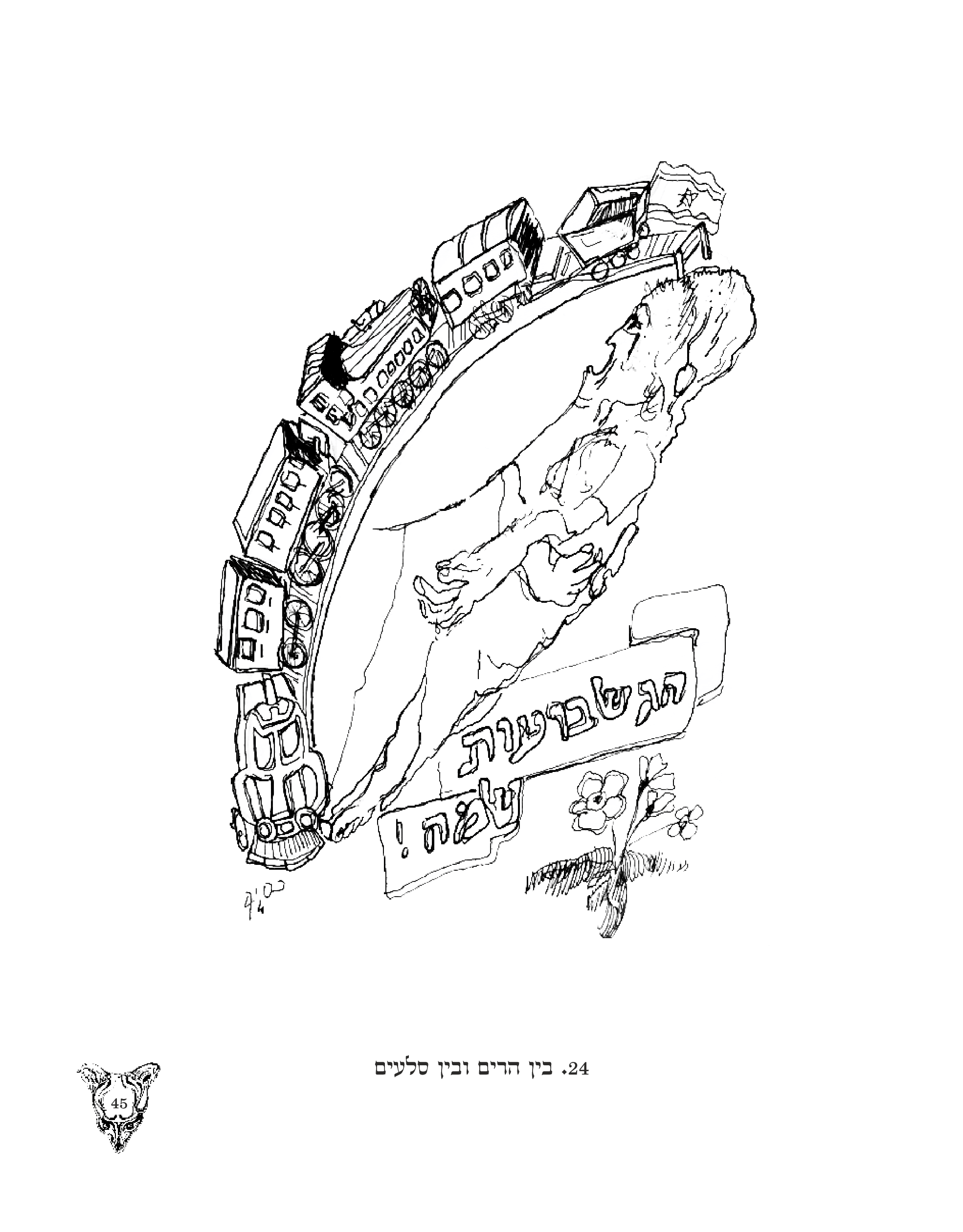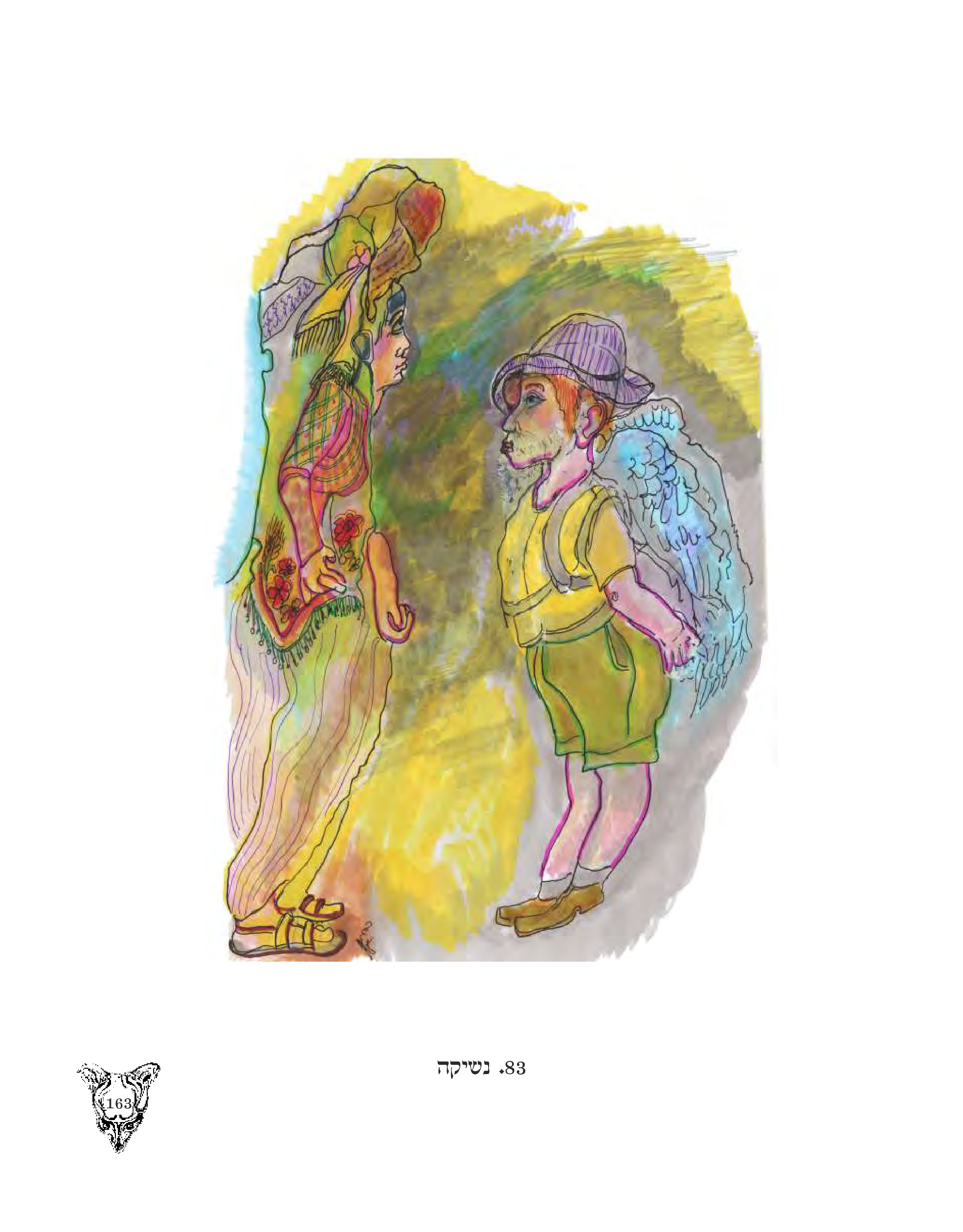 אחר כך המפגש עם ההקדמה המבהירה את הפרופורציות האחרות – ארץ ישראל שלך בגבולות 1967 מציגה מציאות רבודה של הומור וכאב, שעשוע ורצינות, התחכמות ומסר ישיר. ואז פגשתי בשמות ההורים, וחייכתי למראה שמות האבות שלכם – ייתכן ששניהם הגיעו מאותה התפוצה, אך בעוד שמו של האחד נותר נטוע שם – בעבוס, האחר עם שם מפתיע אפילו למי שהעתיק שורשיו לארץ חדשה – אושר. ואז פגשתי את דמויות הוריך – אם גדולה שעיניה מכוסות, כף ידה גדולה, יד ענקים (שמה לאל?) ואב זעיר טומן ידיו בכיסים ומבטו מוסט (לאן?). ציור שעשה עליי רושם מיוחד הו