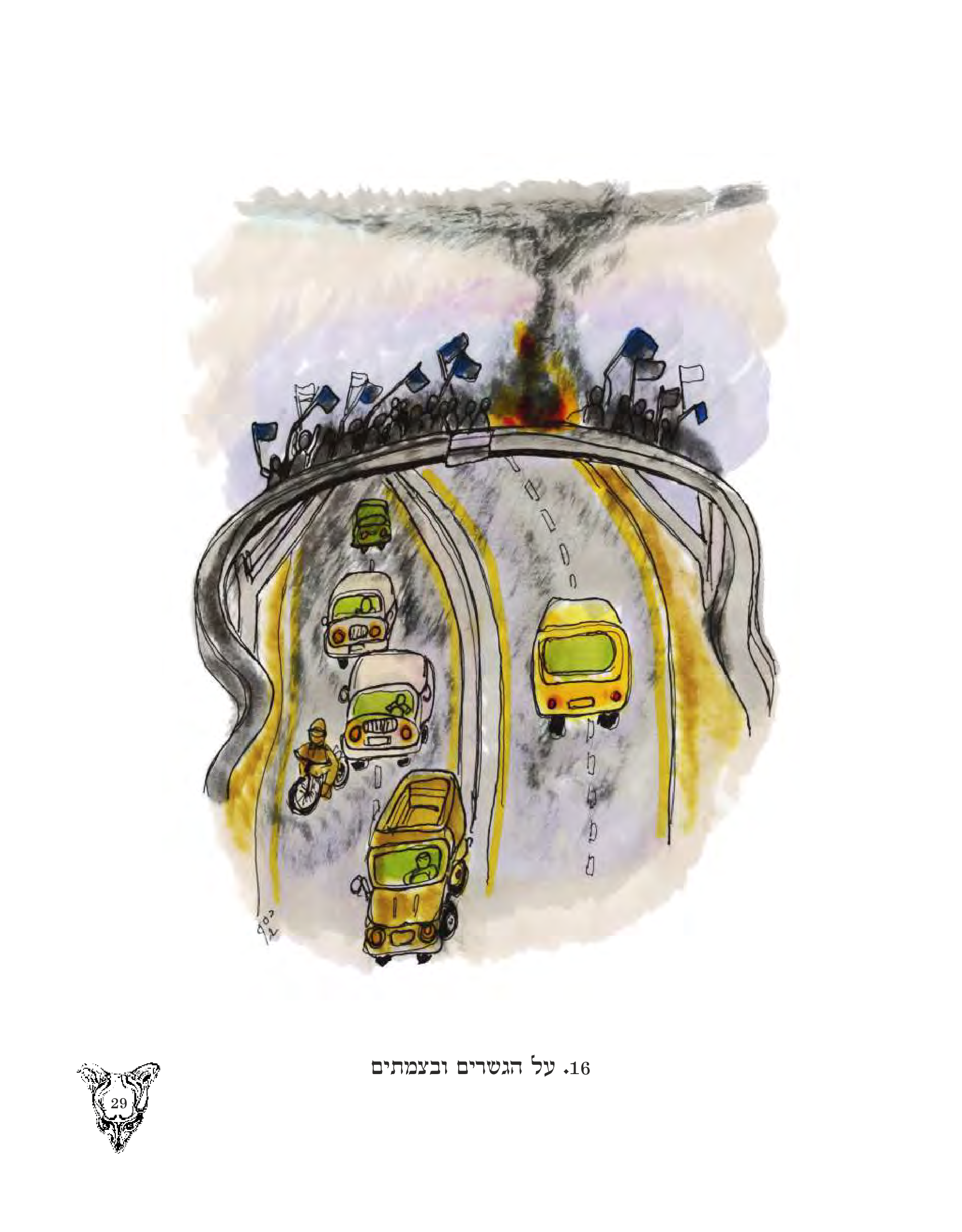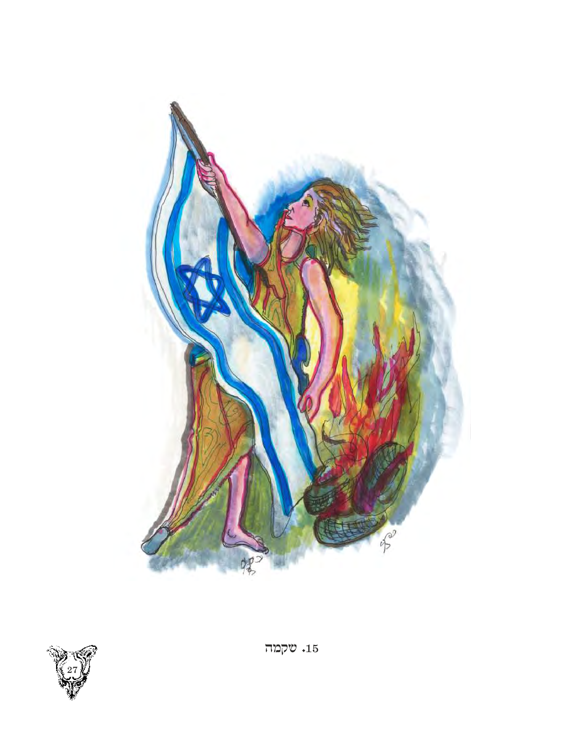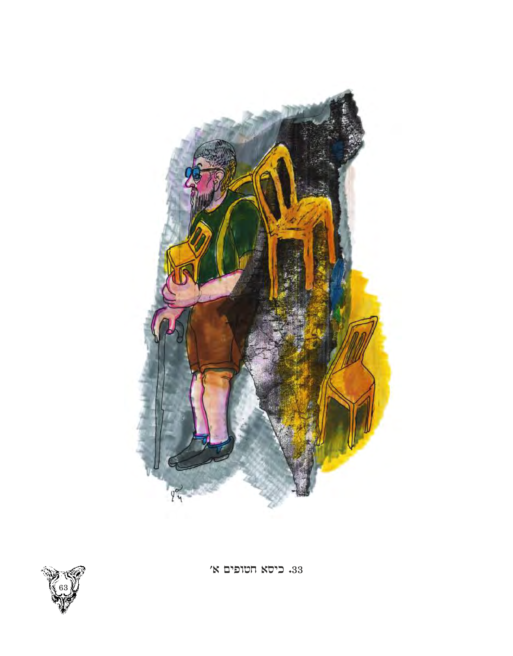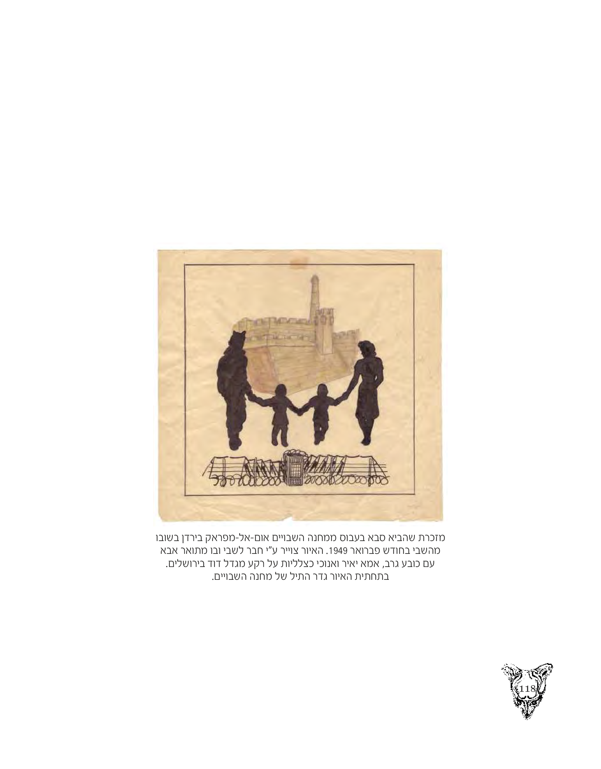אחר כך המפגש עם ההקדמה המבהירה את הפרופורציות האחרות – ארץ ישראל שלך בגבולות 1967 מציגה מציאות רבודה של הומור וכאב, שעשוע ורצינות, התחכמות ומסר ישיר. ואז פגשתי בשמות ההורים, וחייכתי למראה שמות האבות שלכם – ייתכן ששניהם הגיעו מאותה התפוצה, אך בעוד שמו של האחד נותר נטוע שם – בעבוס, האחר עם שם מפתיע אפילו למי שהעתיק שורשיו לארץ חדשה – אושר. ואז פגשתי את דמויות הוריך – אם גדולה שעיניה מכוסות, כף ידה גדולה, יד ענקים (שמה לאל?) ואב זעיר טומן ידיו בכיסים ומבטו מוסט (לאן?). ציור שעשה עליי רושם מיוחד הו