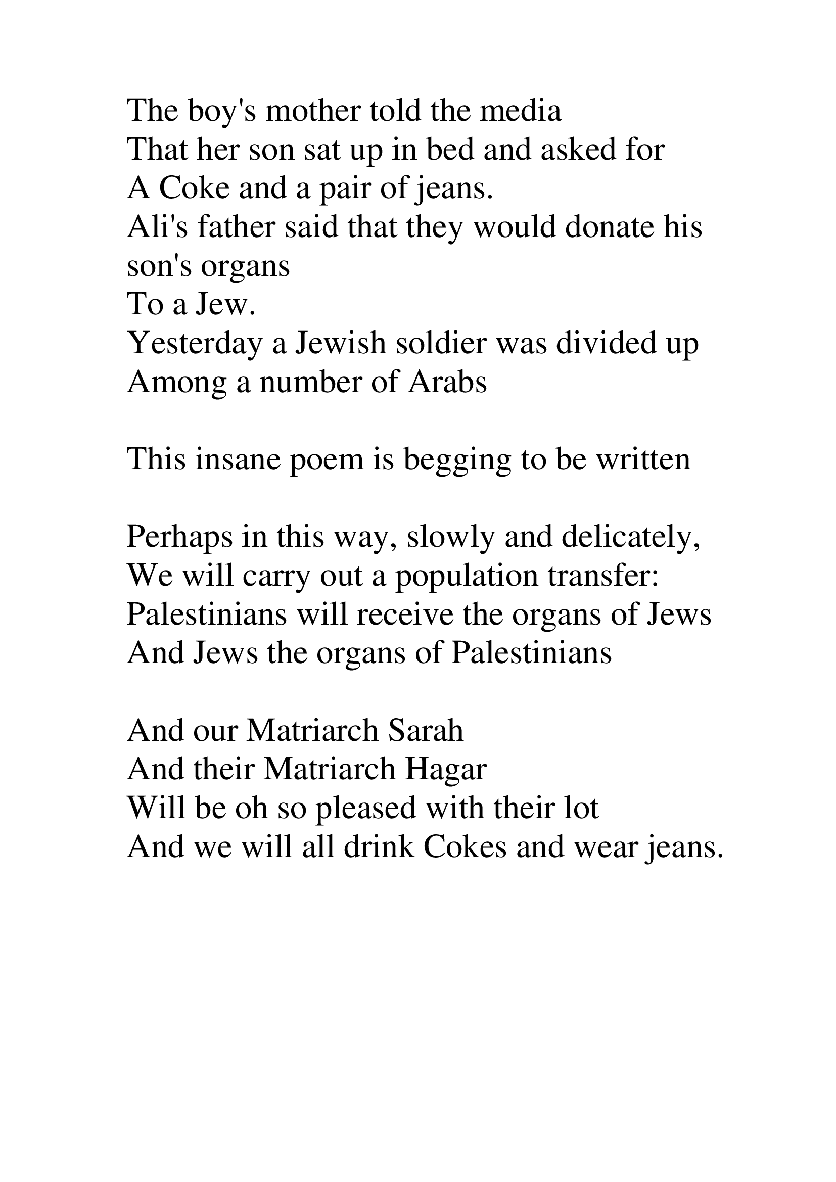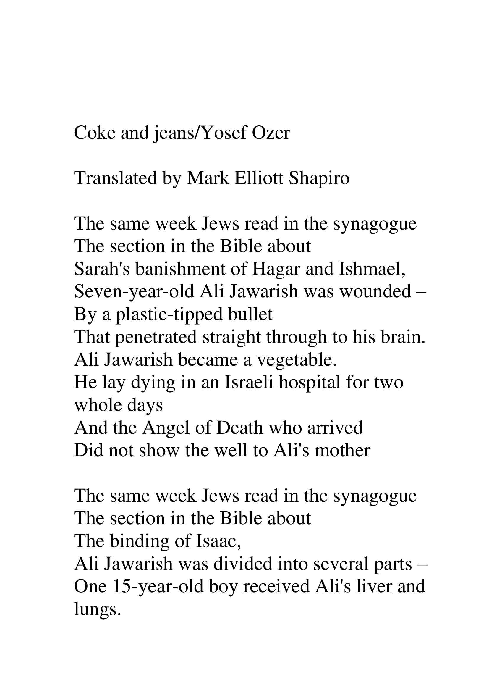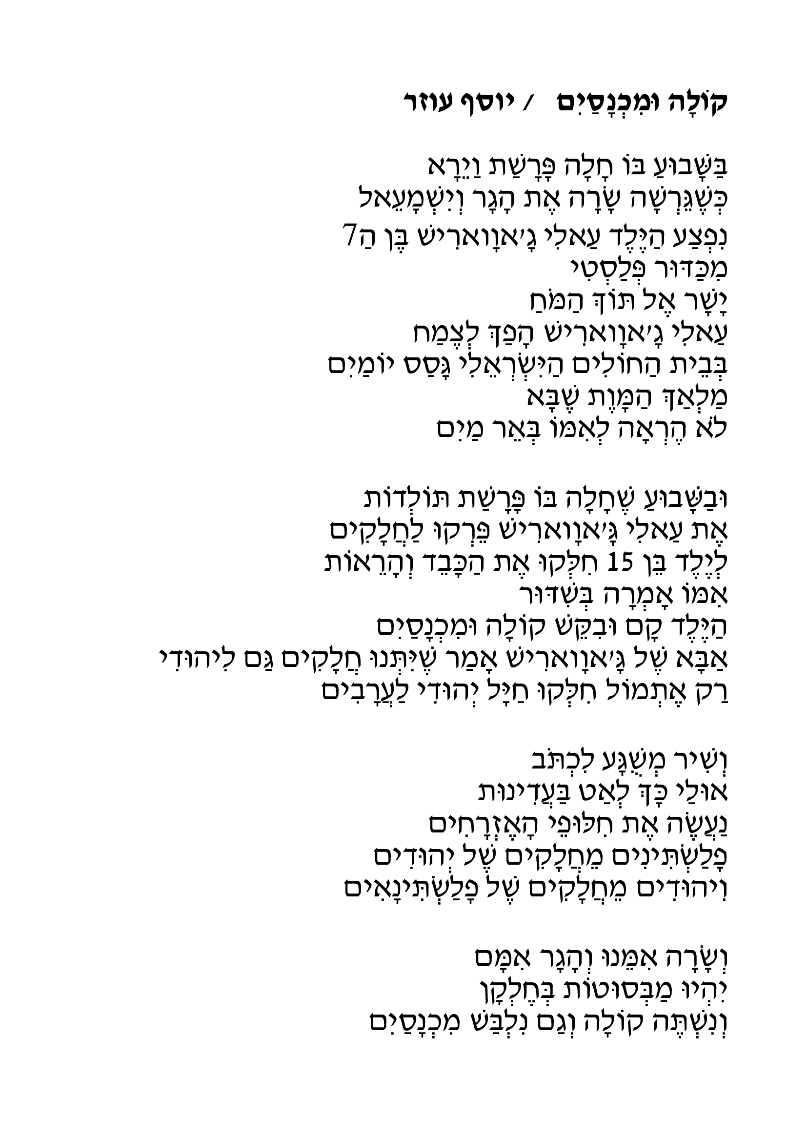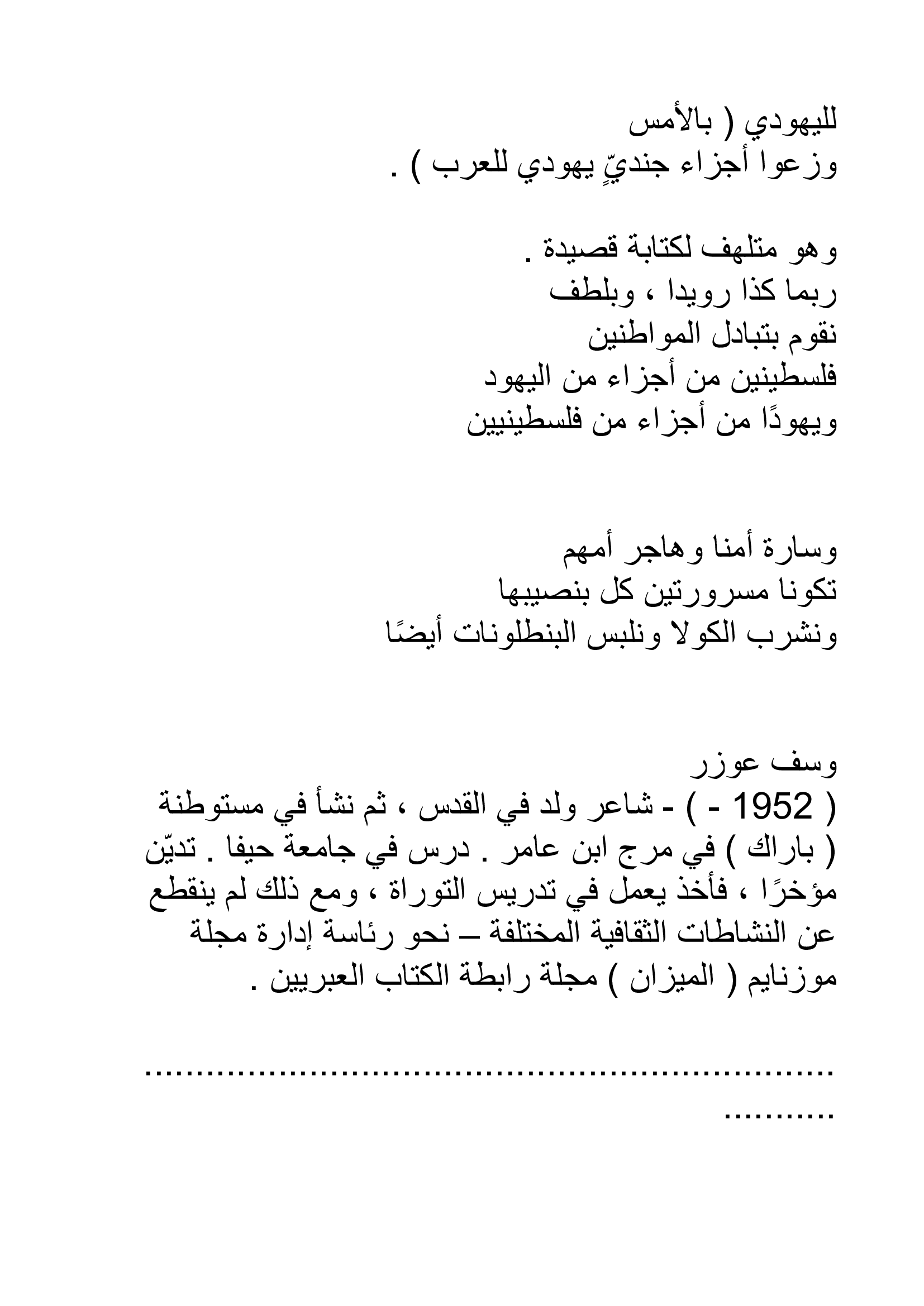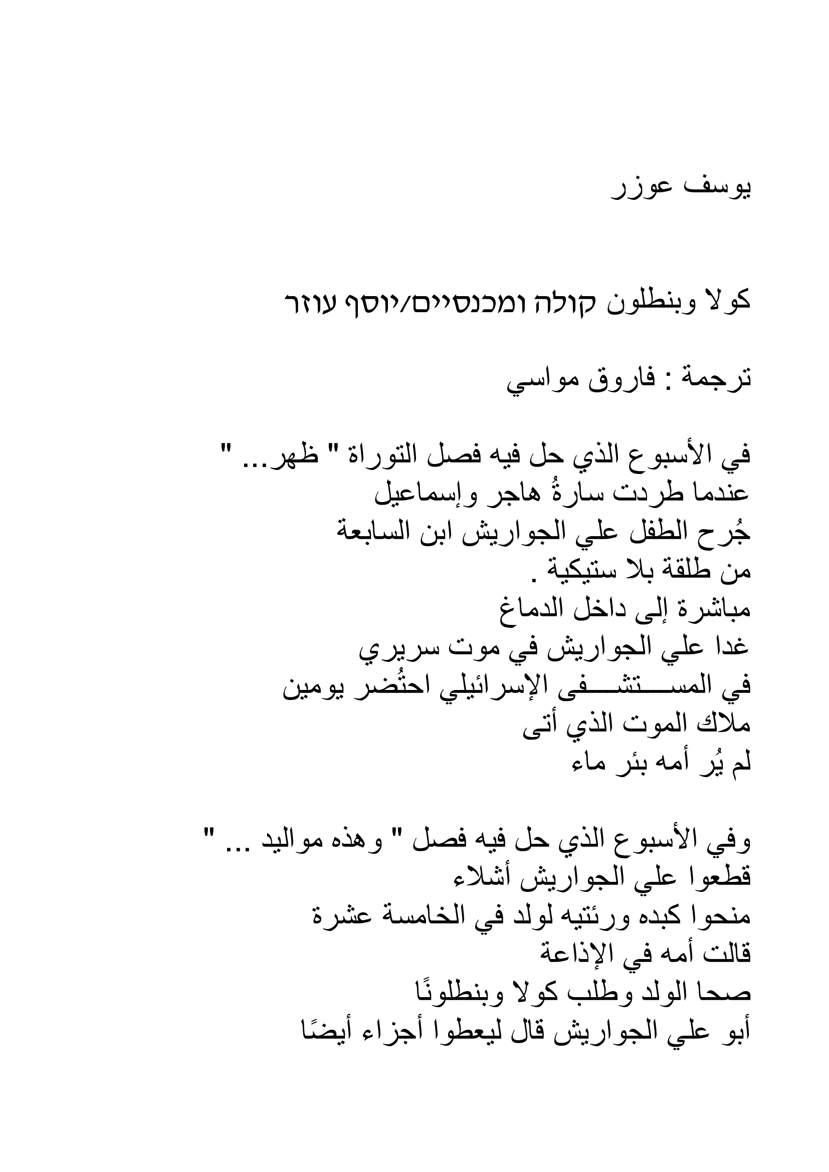 אחד משירי המחאה החזקים שנכתבו כאן בשני העשורים האחרונים. שירו הפוליטי של יוסף עוזר 'קולה ומכנסיים', מגלה רגישות לזוועת הסכסוך הישראלי-ערבי משני צדדיו. תרומת איברים של ילד ערבי שנפצע מכדור פלסטי גם ליהודים מביאה את עוזר לכתוב שיר "משוגע" בנימתו המקאברית המציע "אולי כך לאט, בעדינות,/ נעשה את חילופי האזרחים/ פלשתינאים מחלקים של יהודים/ ויהודים מחלקים של פלשתינאים".
