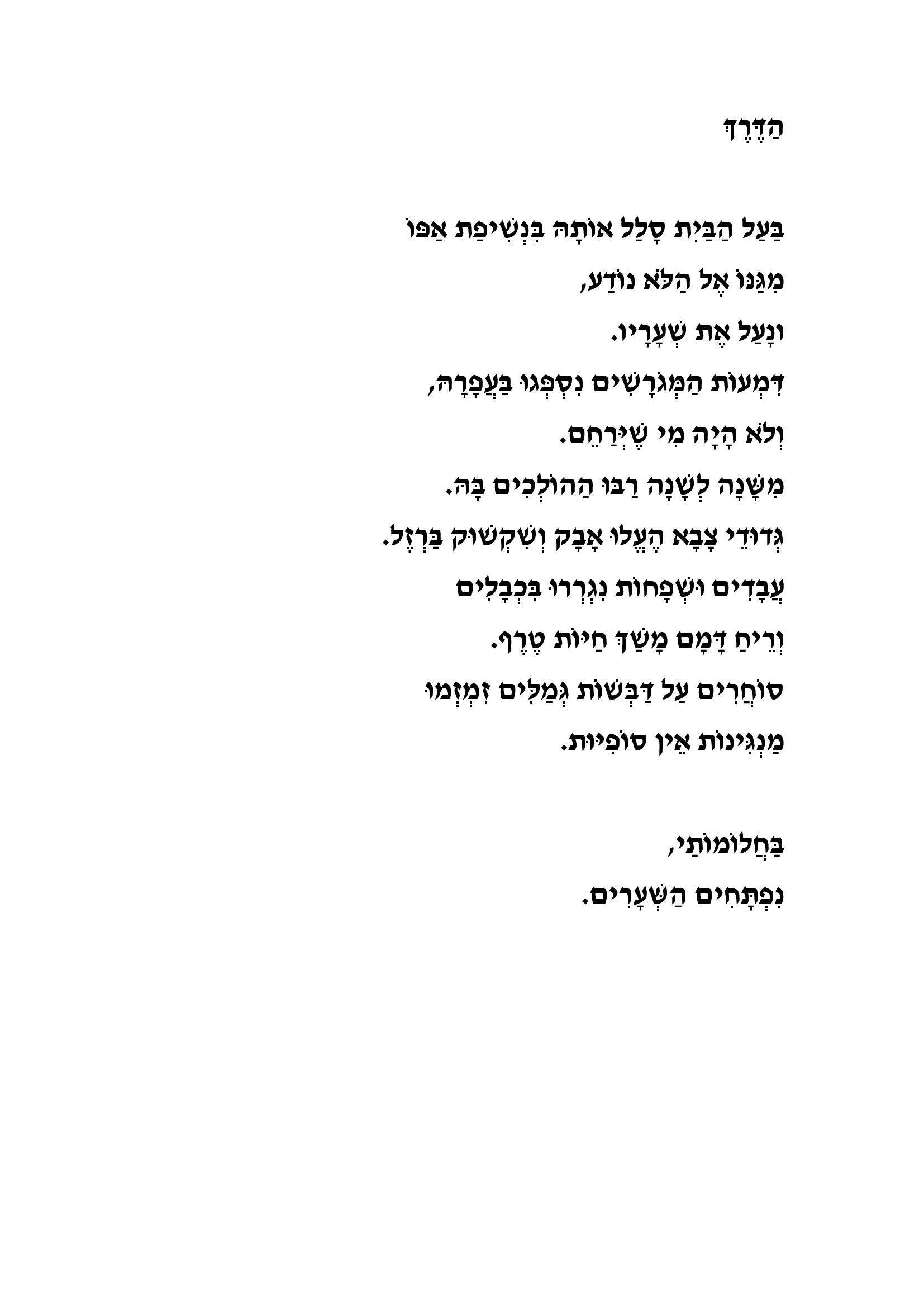 שיר נפלא על הגרוש מגן עדן שגזר על האנושות כולה חיים של עבדות, חיים קשים. משיכה בעול החיים שמשמעותם לא נודעת, בעצם חיים סזיפיים אם כי מלאי יצרים, אלימות והמון סואן שמדי שנה הולך וגדל עד מחנק, המשורר מייחל לפתיחת השערים מחדש בתקווה שתקטע את המחזוריות הסיזיפית ותחזיר את האדם לגן העדן.זהו חלום אוטופי שנגלה לו רק בחלומות.