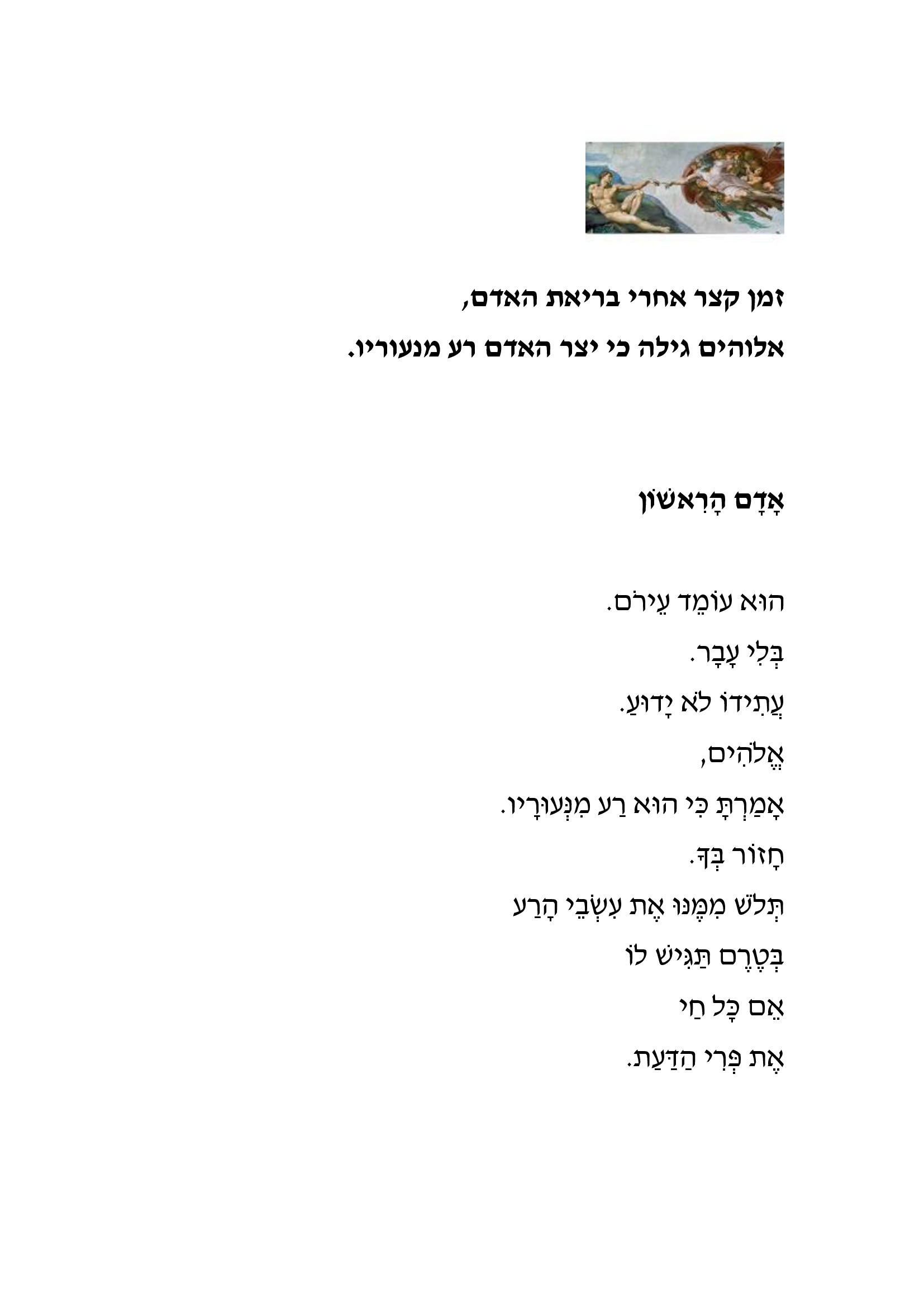 אהבתי את האדם הראשון ונסיון ההתמודדות עם היצר והרוע. עם האשה. מבינה את העתיד הנסתר . אשמח להבין מדוע לקחת לו את עברו. מ א ד אהבתי את השיר. אני רואה בו הרבה עומק. תודה.