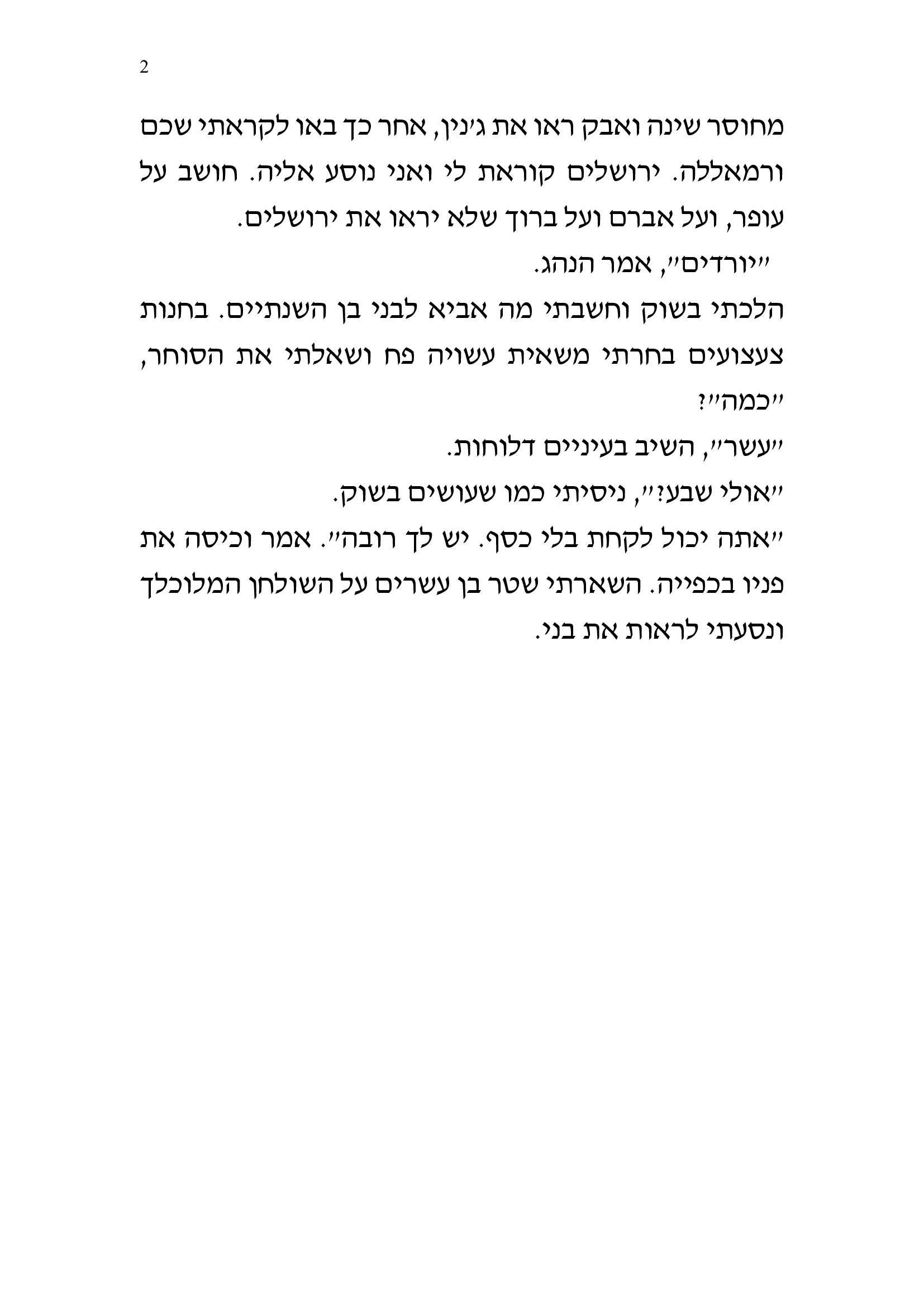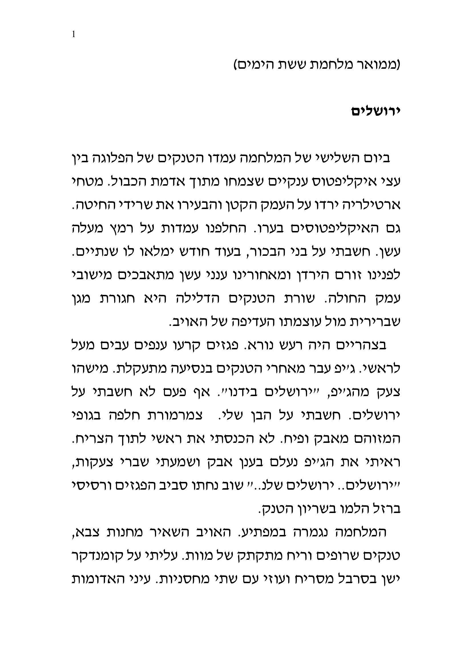 וואו. איזה סיפור. קצר מאד ומקפל בתוכו הכל: אימת המלחמה ואיוולתה. האיש הבודד מול הכאוס והמוות סביב, כל סיפור הגבורה של כיבוש ירושלים שמתגמד, מחוויר לעומת הגעגוע והכמיהה של אב צעיר לבנו. וגם האנושיות הפשוטה בין בני אדם גם אם זה כובש ונכבש... החמלה. סיפור נפלא באמת וכתוב ביד אמן עם נפש אומן.